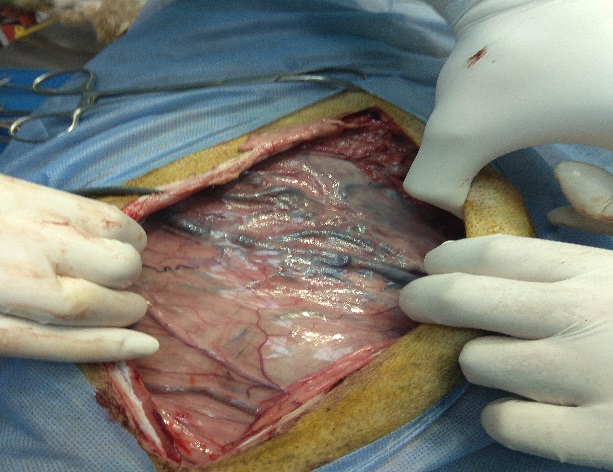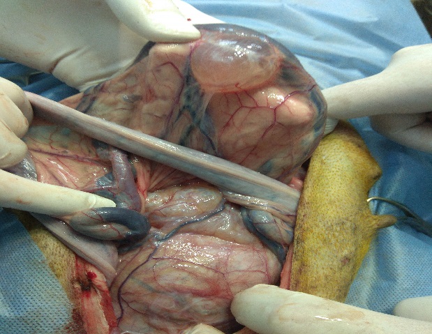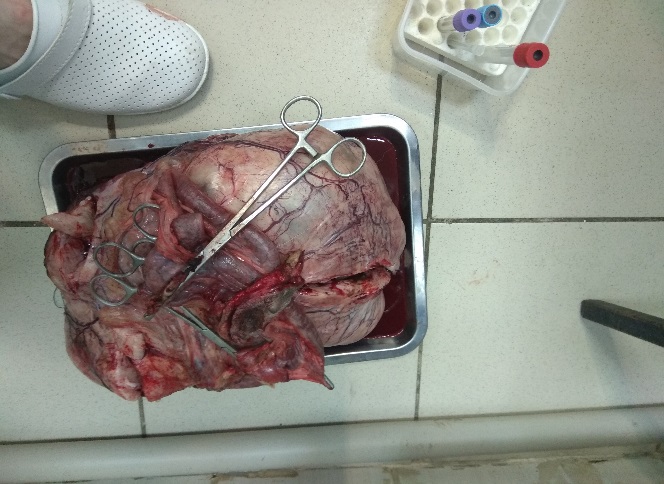 На приеме была собака немецкая овчарка, 12 лет, сука. С жалобами на вялость, апатию, снижению аппетита. Пальпаторно в брюшной полости отмечалось массивное образование, Температура тела 38,4 *С , слизистые розовые, лимфоузлы не увеличены. По результатам диагностики ( рентгенологического исследования, УЗД диагностики, анализов крови и др.) выявлено массивное новообразования диаметром 60 см. Животное было прооперировано, новообразование на левом яичнике, вес :6,900 кг. На данный момент животное выписано из стационара, состояние животного хорошее. На цитологии выявлены признаки атипии. Отправлен материал на гистологию. Рекомендована консультация онколога.