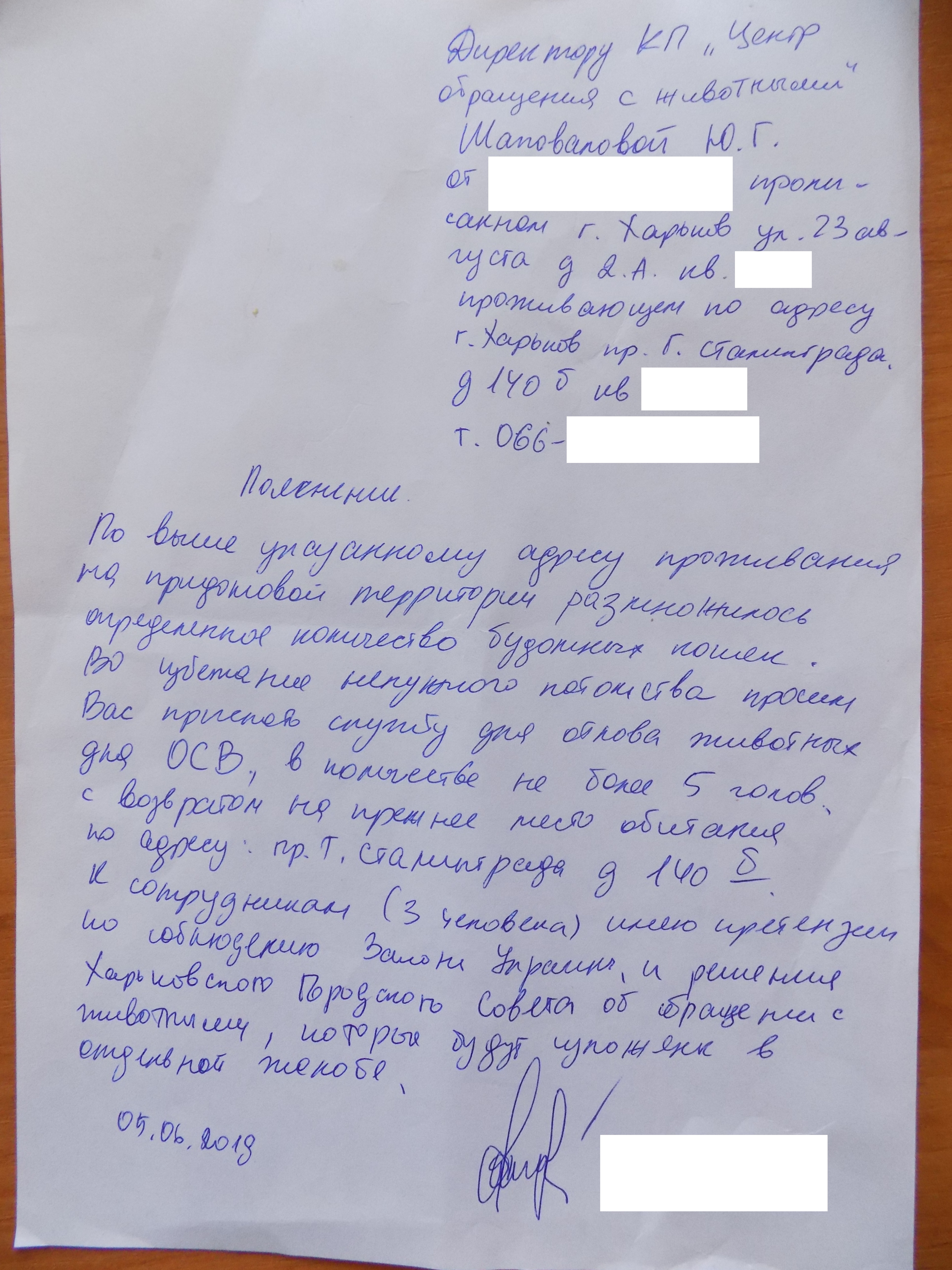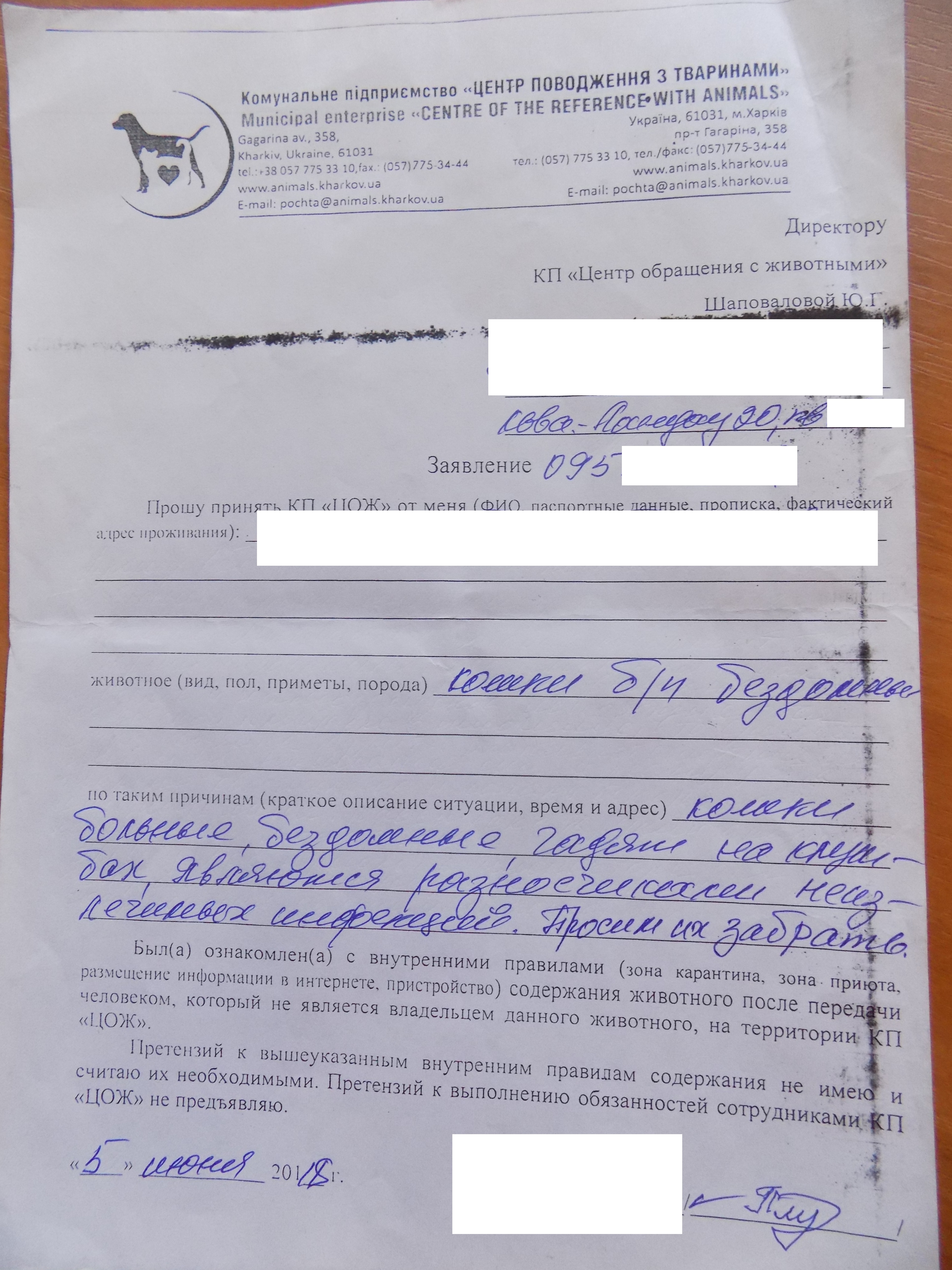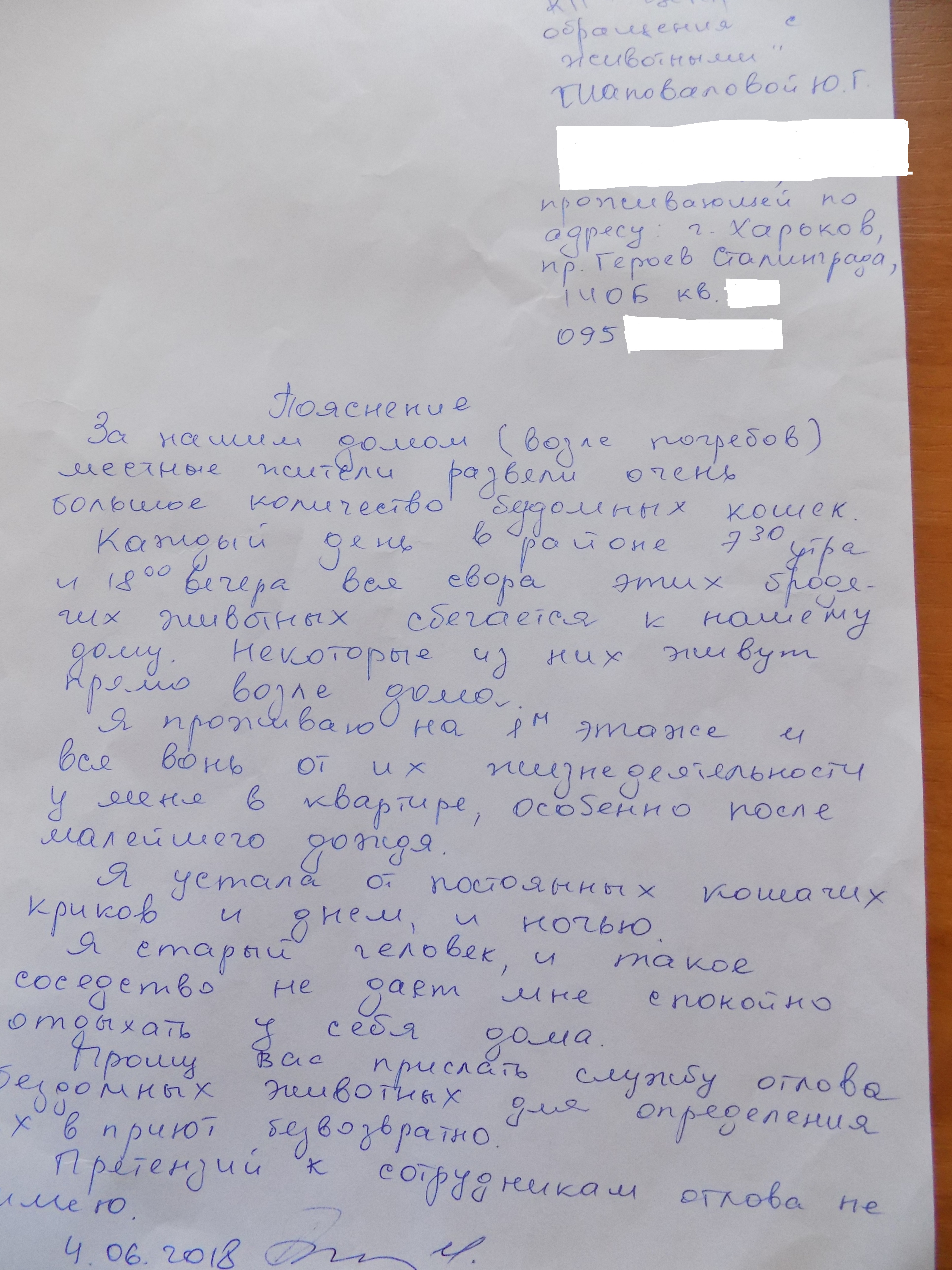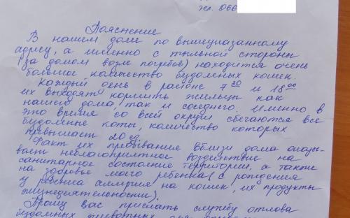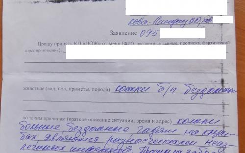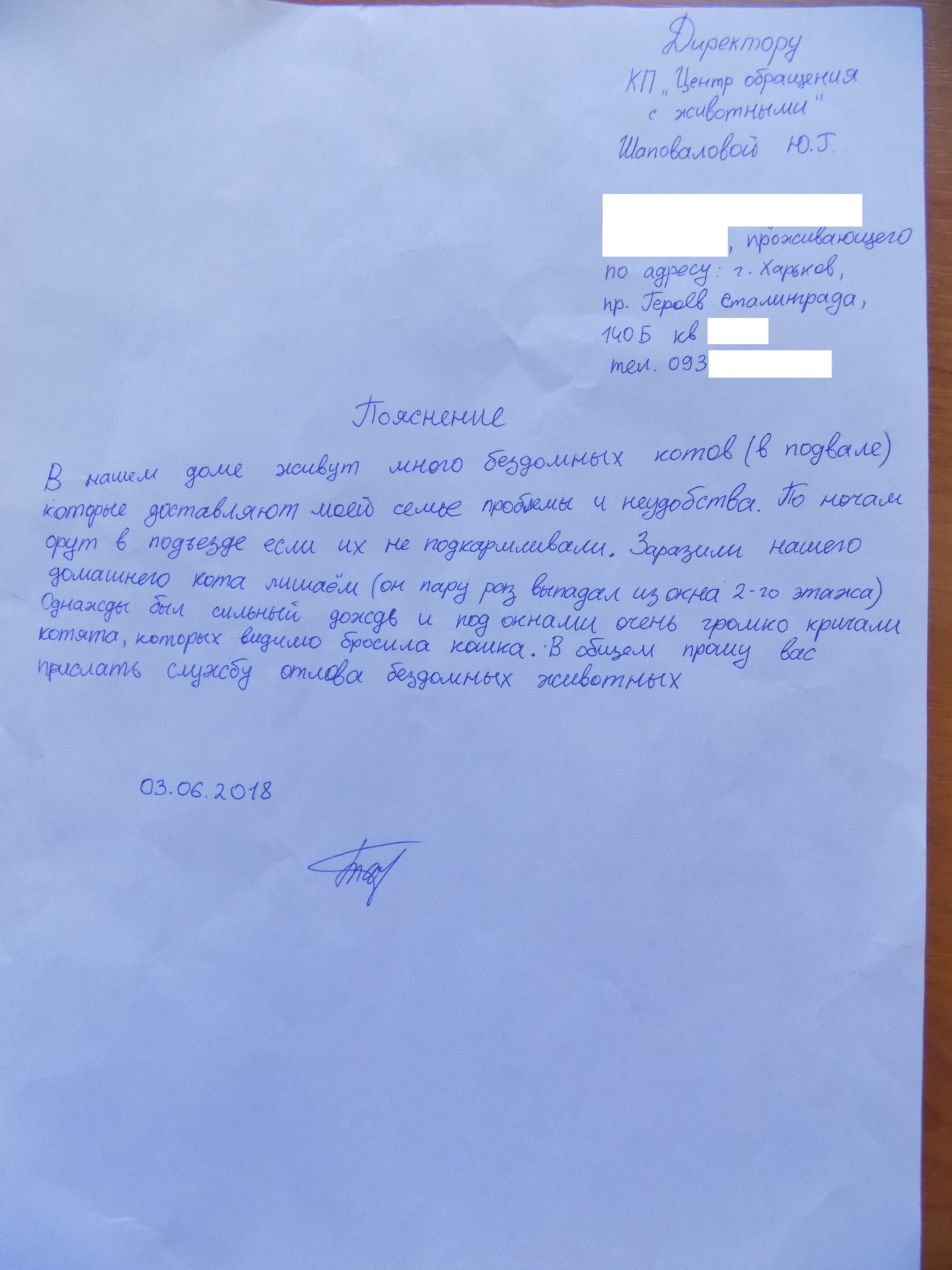 История про бездомных котят, которые обитают по адресу проспект Героев Сталинграда 140 Б, началась 3 июня. Именно в этот день в «ЦОЖ» поступила первая заявка – жалоба, в которой говориться: «в нашем доме живет много бездомных котов, которые доставляют моей семье проблемы. Прошу вас службу отлова бездомных животных». Далее и подпись и дата. На следующий день новая заявка – жалоба: «Я проживаю на первом этаже, и вся вонь от их жизнедеятельности котов у меня в квартире, особенно после дождя. Претензий к сотрудникам отлова не имею». Далее еще три заявления от жильцов этого же дома, итого 5 заявлений. Каждая подкреплена подписью.