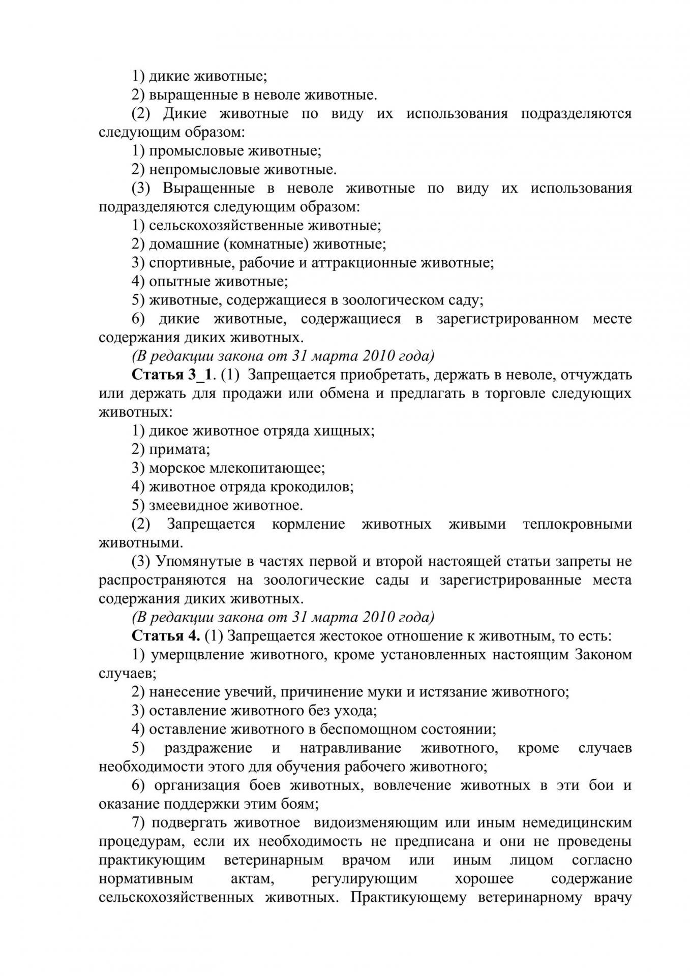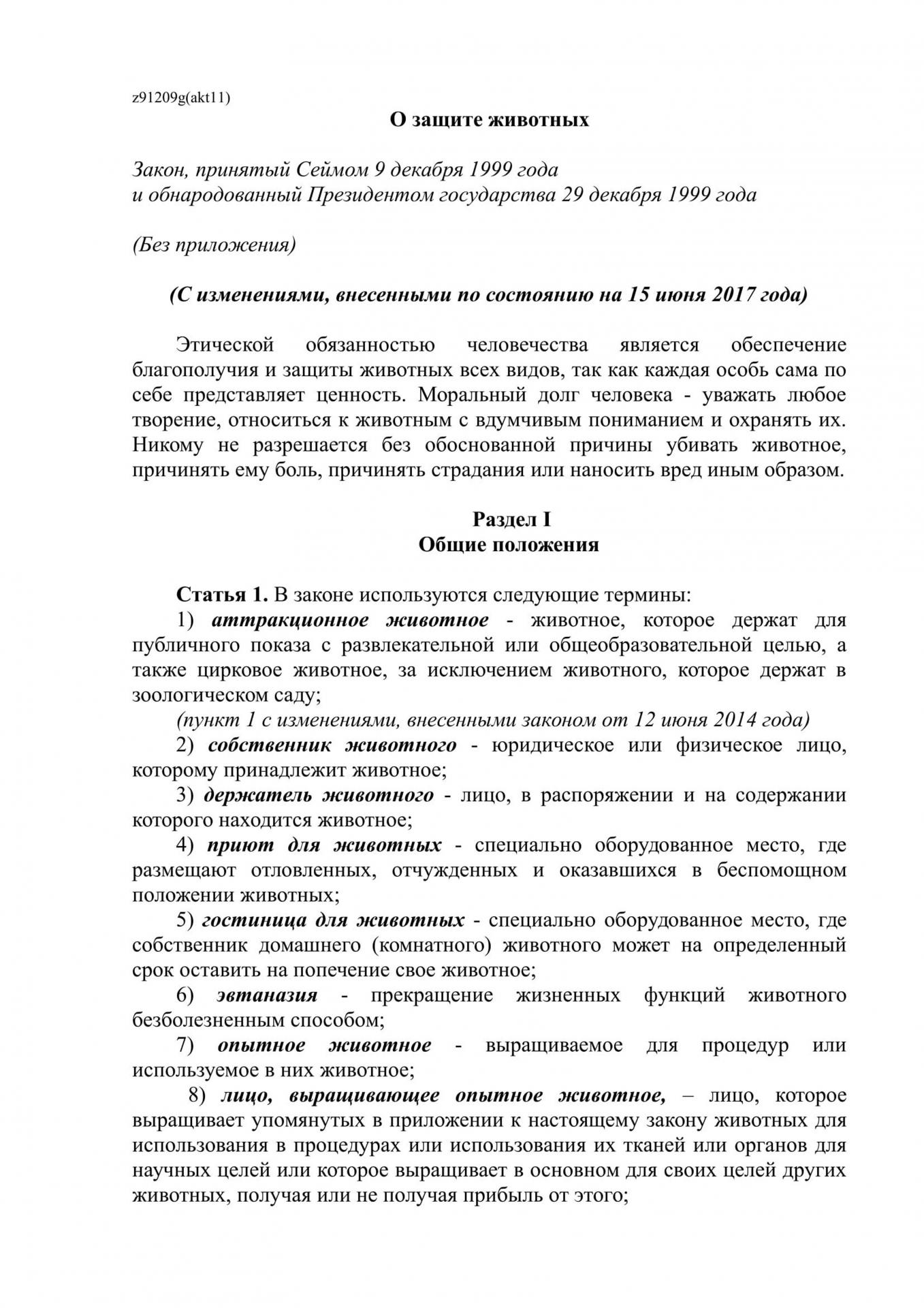 “Этической обязанностью человечества является обеспечение благополучия и защиты животных всех видов, так как каждая особь сама по себе представляет ценность. Моральный долг человека - уважать любое творение, относиться к животным с вдумчивым пониманием и охранять их. Никому не разрешается без обоснованной причины убивать животное, причинять ему боль, причинять страдания или наносить вред иным образом.” – основная норма Закона Латвии «О защите животных», принятого Сеймом 9 декабря 1999 года.