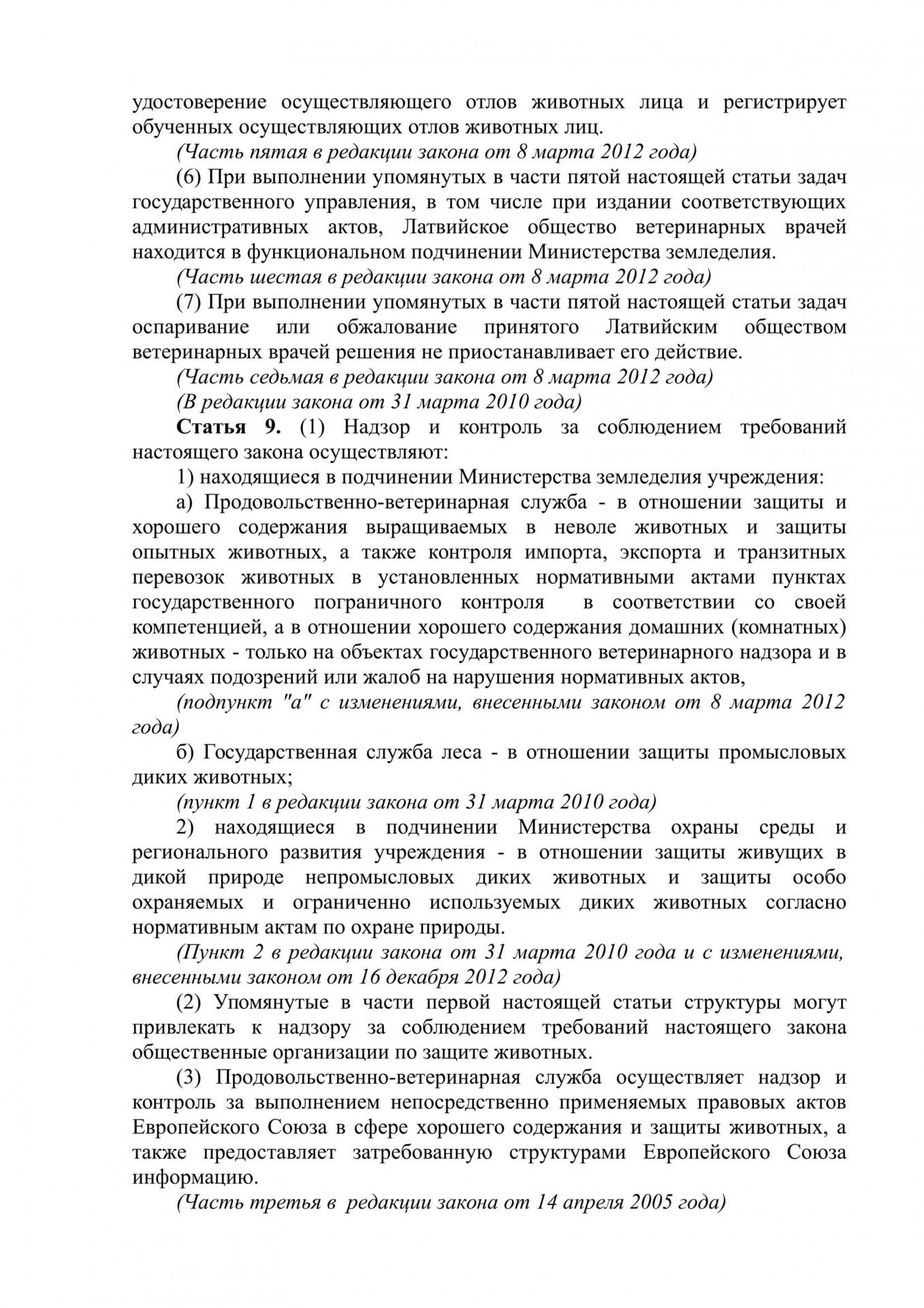 Согласно ст.106 Кодекса Латвии об административных правонарушениях за нарушение требований в области перевозки, использования и содержания животных дается предупреждение или накладывается на физических лиц денежный штраф от 5 до 250 латов, на юридических лиц – от 10 до 500 латов, с конфискацией животных или без нее.