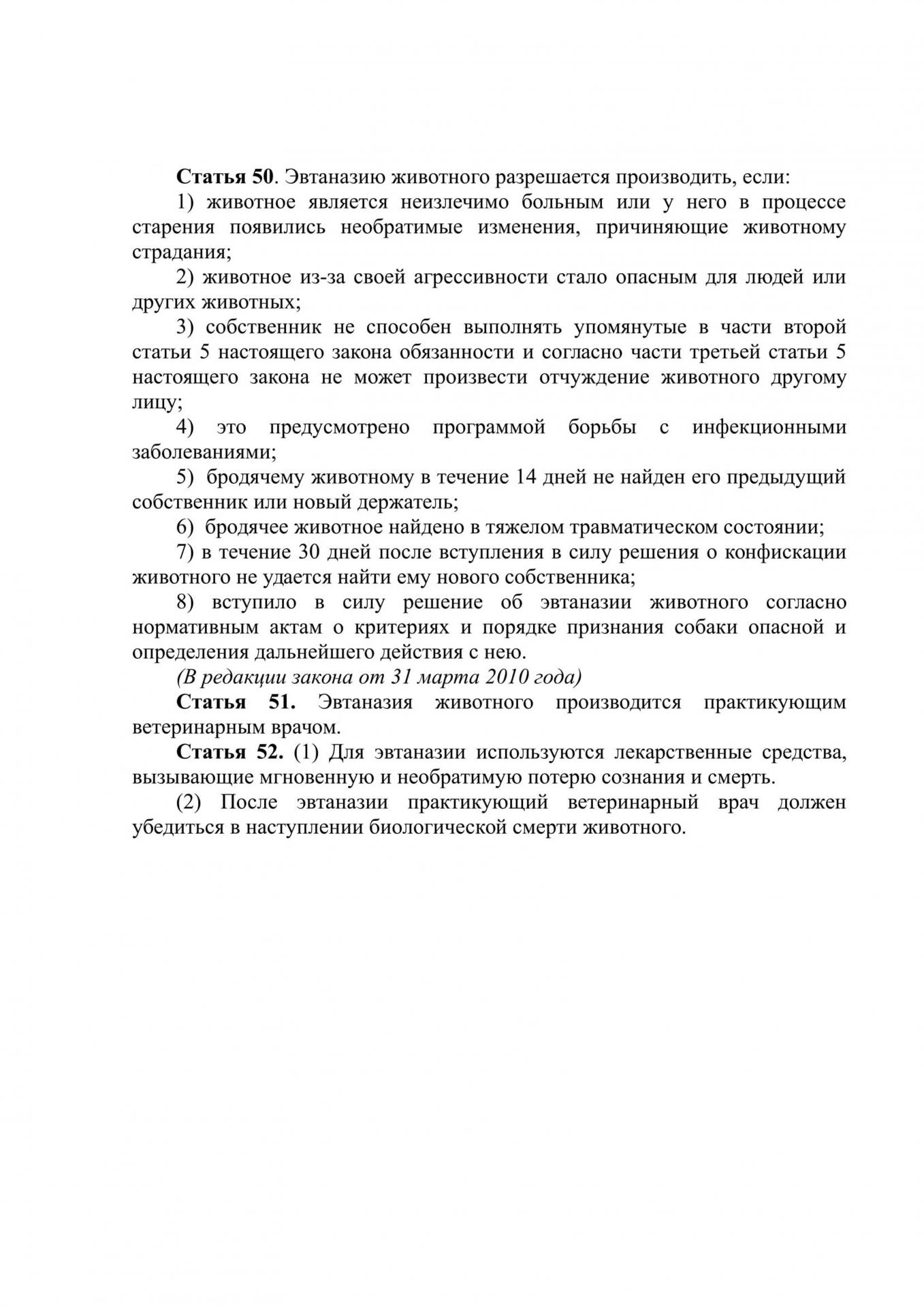 Согласно ст.1061 Кодекса Латвии об административных правонарушениях за нарушение требований в области уничтожения животных или за жестокое обращение с животными накладывается на физических лиц денежный штраф от 5 до 250 латов, на юридических лиц – от 10 до 500 латов, с конфискацией животных или без нее.