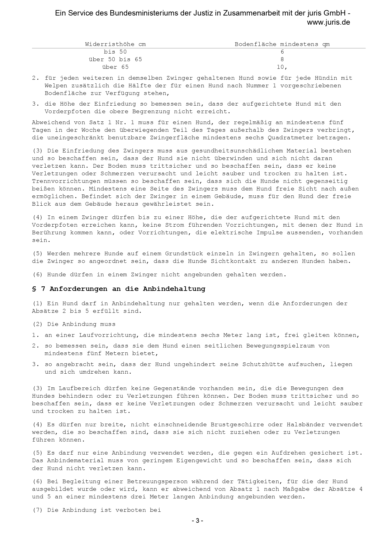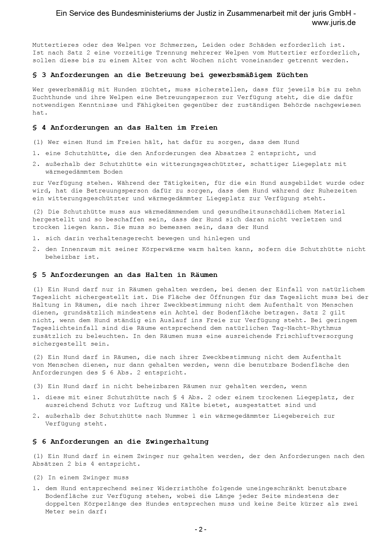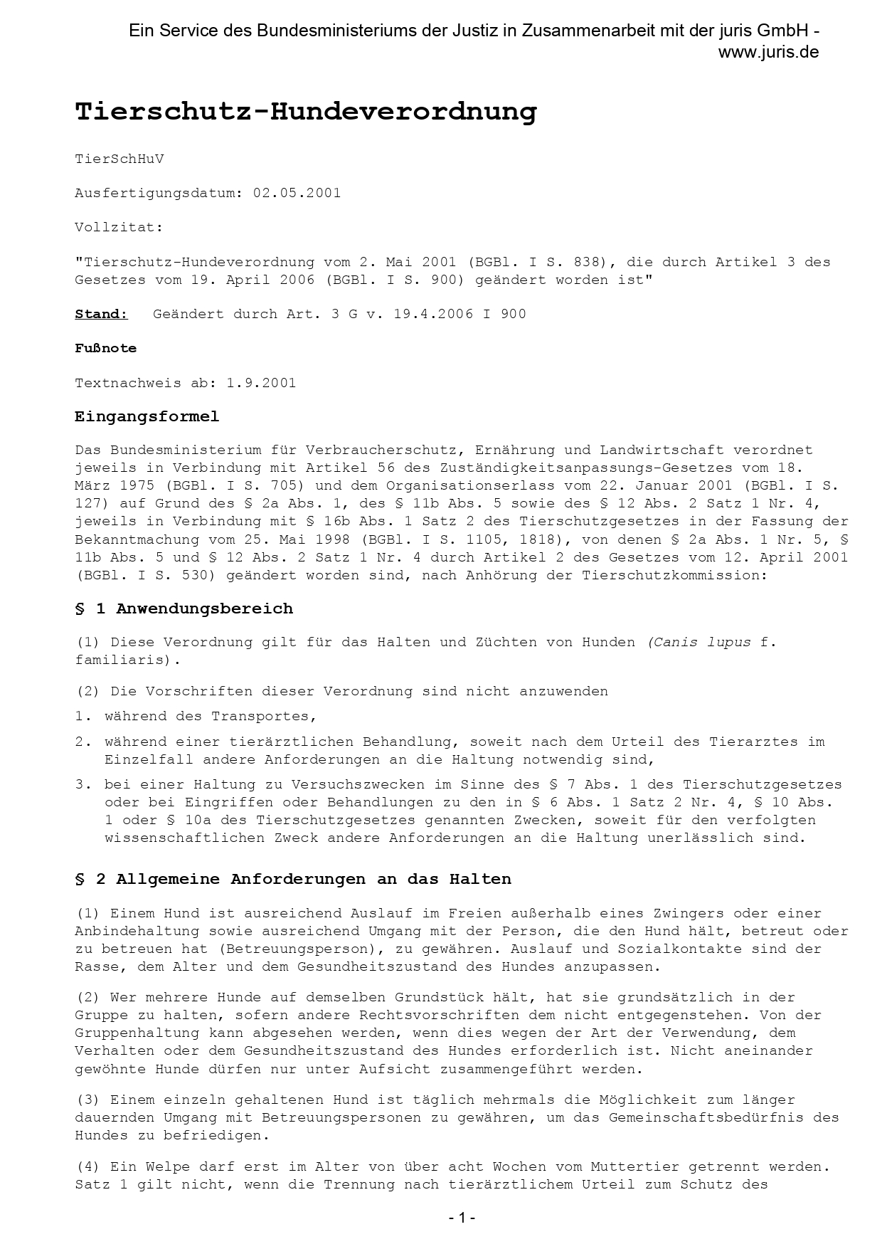 TierSchHuV Дата составления: 02.05.2001 Полное название: "Положение о защите и содержании собак от 2 мая 2001 г. (Федеральный кодекс законов (BGBl.) I стр. 838), измененное статьей 3 закона от 19 апреля 2006 г. (BGBl. I, стр. 900)". Состояние: изменено статьей 3 Закона от 19.4.2006 I 900 Сноска Дата составления текста: 1.9.2001 Введение: Федеральное министерство по защите прав потребителей, продуктам питания и сельского хозяйства постановляет после заслушивания комиссии по защите животных, основываясь на статье 56 Закона об упорядочении компетентности органов от 18 марта 1975 г. (BGBl. I, стр. 705) и Приказе от 22 января 2001 г. (BGBl. I, стр. 127), § 2a п. 1, § 11b п. 5, а также § 12 п. 2 абз. 1 № 4, § 16b п. 1 абз. 2 Закона о защите животных в редакции от 25 мая 1998 г. (BGBl. I, стр. 1105, 1818), из которых § 2a п. 1 № 5, § 11b п. 5 и § 12 п. 2 абз. 1 № 4 изменены статьей 2 Закона от 12 апреля 2001 г. (BGBl. I, стр. 530), следующее: