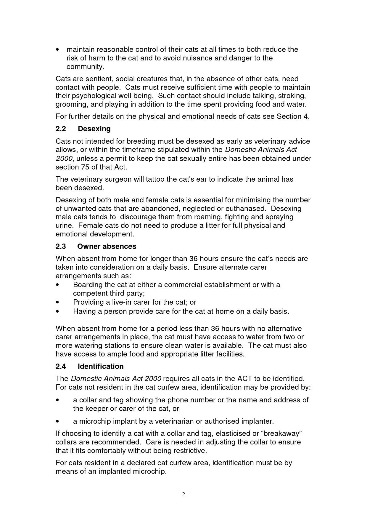 Согласно закону о домашних животных, действующему на тер-рии федеральной столицы Австралии, все кошки должны быть идентифицированы. Для идентификации кошки, не проживающей в зоне, где действует запрет на свободный выгул кошек (комендантский час для кошек – животное должно находиться 24 часа в сутки на тер-рии владельца), достаточно ошейника с жетоном, на котором выгравирован номер телефона или имя и адрес владельца или микрочипа, вживляемого ветеринаром или уполномоченным специалистом. Для кошек, проживающих в зоне «комендантского часа», чипирование обязательно. Это даст возможность идентифицировать животное в приюте или ветклинике и быстро вернуть владельцу. Очень важно вовремя предоставить в базу данных сведения о смене телефонного номера, адреса или о том, что животное передано новому владельцу.