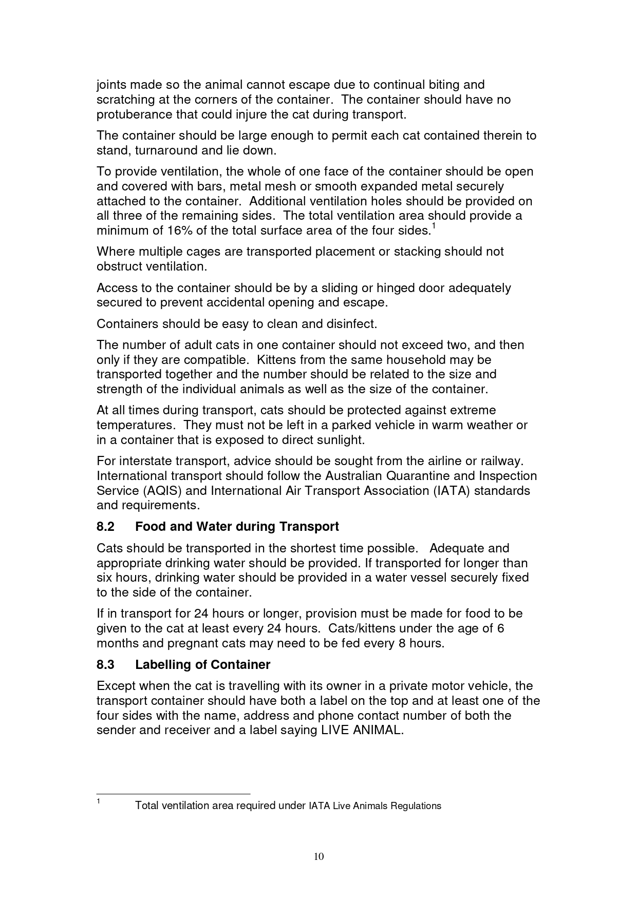 Кошек можно перевозить в автомобилях, поездах или самолетах. Лицо (лица) или компания, ответственная за перевозку животного, должна убедиться, что стресс для животного сведен к минимуму, исключена возможность получения животным травмы, исключена возможность побега. Вид транспорта для перевозки подбирается в соответствии с расстоянием до пункта назначения, с тем, насколько кошка привычна к поездкам, с состоянием здоровья кошки. В большинстве случаев во время транспортировки кошку следует поместить в контейнер. Контейнер должен находиться в устойчивом положении и должен быть защищен от движения и опрокидывания в течение всей поездки. Контейнер может быть сделан из твердого пластика, металла или дерева. Из картонной коробки кошка может с легкостью выбраться и сбежать. Контейнер должен быть крепким, прочным в местах соединения деталей, устойчивым к царапанию и кусанию, чтобы исключить возможность побега, не содержать неровностей и выступающих частей, которые бы могли травмировать кошку. Контейнер должен быть достаточно большим для того, чтобы каждая находящаяся в нем кошка могла без труда стоять, разворачиваться и ложиться. Одна сторона контейнера должна быть открытой, затянутой решеткой или металлической сеткой, надежно прикрепленной к контейнеру (решетчатая дверца на петлях с замком). Три остальных стороны должны содержать дополнительные вентиляционные отверстия. Общая площадь вентиляционных отверстий должна составлять не менее 16% от площади всех четырех сторон контейнера. Если транспортируется несколько клеток или контейнеров с животными, их следует располагать таким образом, чтобы ничто не препятствовало вентиляции. Доступ в контейнер должен быть через раздвижную или откидную дверцу, достаточно крепкую и надежную, чтобы предотвратить побег животного. Контейнер должен быть сделан так, чтобы его легко можно было чистить и дезинфицировать. Кол-во взрослых кошек, перевозимых в одном контейнере – не более двух (и только в том случае, если они нормально уживаются друг с другом). Котята из одного помета или проживающие в одном доме могут перевозиться вместе, допустимое количество зависит от размера и силы каждого животного и от размера контейнера. Во время перевозки кошки должны быть защищены от высоких и низких температур. Недопустимо оставлять кошку в закрытой припаркованной машине в жару или в контейнере под прямыми солнечными лучами. Для перевозки животных между штатами (внутри страны) следует пользоваться поездом или самолетом. Международные перевозки должны происходить в соответствии с действующим законодательством Австралии с соблюдением всех норм и правил, установленных карантинными службами и службами контроля, а также правилами Международной ассоциации воздушного транспорта.