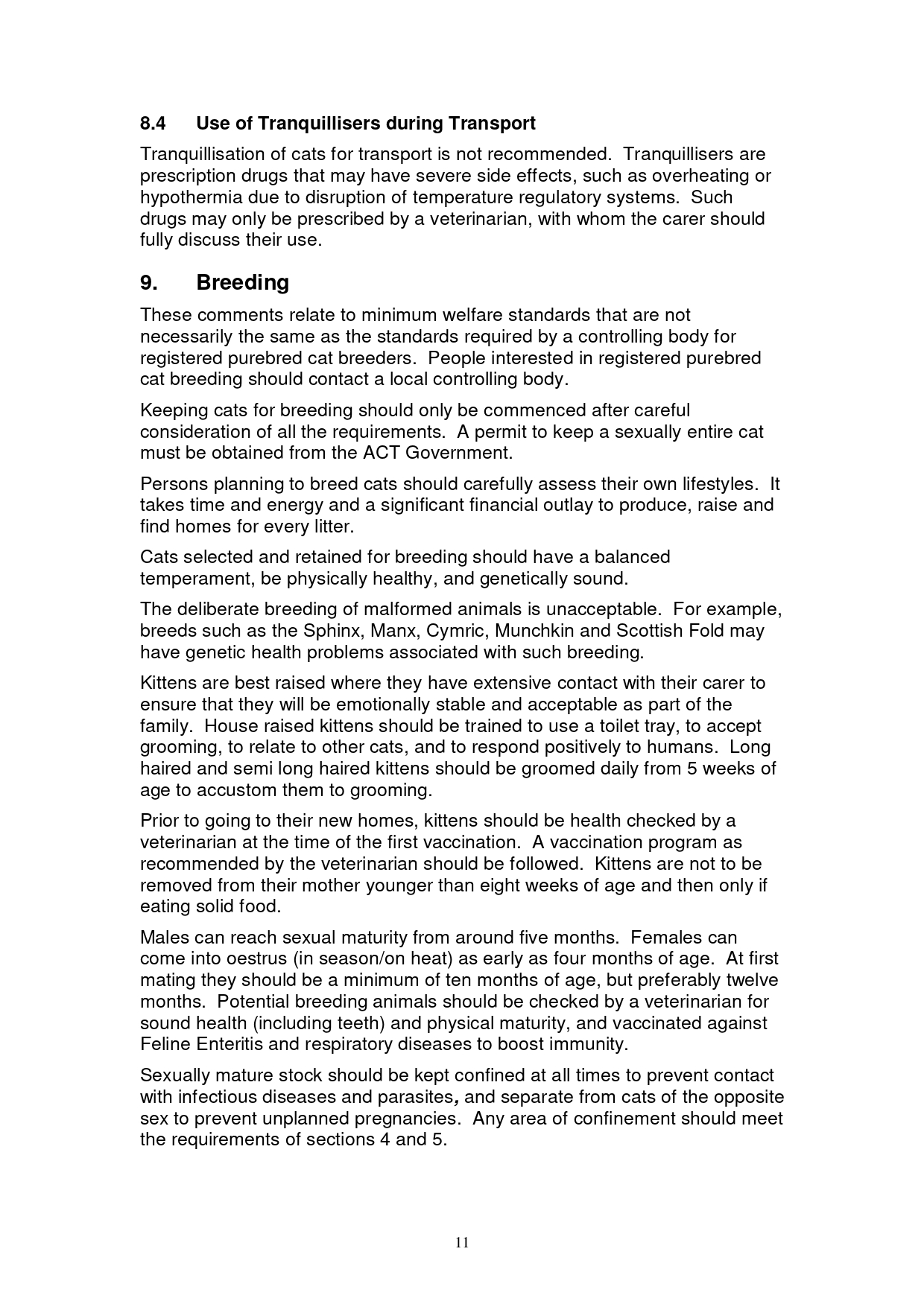 Следующие комментарии относятся к необходимым стандартам и не обязательно совпадают со стандартами зарегистрированных заводчиков чистопородных кошек. Лицам, заинтересованным в официальном разведении породистых кошек следует связаться с местными контролирующими органами. Содержание кошек в целях разведения допускается лишь после тщательной проверки соответствия всем стандартам и соблюдения всех правил. Необходимо получить от правительства федеральной столицы специальное разрешение на содержание сексуально активных особей. Лицо, планирующее заняться разведением кошек, должно соотнести это со своими возможностями, учесть, что это занятие (получить, вырастить и пристроить здоровое потомство) требует немалых финансовых вложений, временных и эмоциональных затрат. Животные, отобранные для участия в разведении должны иметь уравновешенный характер, быть физически здоровыми и не иметь врожденных пороков и дефектов. Намеренное разведение уродливых животных с физическими отклонениями и дефектами недопустимо. К примеру: Сфинкс, Манчкин, Скоттиш Фолд, Мэнкс и некоторые другие породы имеют некоторые врожденные проблемы со здоровьем, что является результатом селекции. Лучше всего котята развиваются в условия постоянного контакта с владельцем (заводчиком). В этом случае они вырастают эмоционально стабильными и без проблем становятся частью семьи. Котята, выращенные в доме, должны быть приучены к пользованию туалетом, расчесыванию, нормальному общению с другими кошками и людьми. Чтобы приучить длинношерстных котят и котят с шерстью средней длины к регулярному уходу за шерстью, их следует ежедневно расчесывать, начиная с пятинедельного возраста. Прежде чем отправиться к новым владельцам, котята должны пройти тщательный ветосмотр во время первой плановой прививки. Все необходимые прививки должны быть сделаны. Котят нельзя разлучать с матерью до достижения ими восьминедельного возраста и до того, как они научатся употреблять твердую пищу. Коты достигают половой зрелости уже с пятимесячного возраста. Первая течка у кошек может наступить уже после четырех месяцев. Для первой вязки животное должно быть не моложе 10 месяцев, предпочтительнее - года. Животные, предназначенные для разведения, должны пройти необходимый ветосмотр и быть привиты от Кошачьего Энтерита и респираторных заболеваний для укрепления иммунитета. Половозрелые особи должны быть защищены от инфекционных заболеваний и паразитов, и изолированы от животных противоположного пола, во избежание внеплановой беременности. Половозрелые коты могут сосуществовать в одном доме со стерилизованной кошкой либо кастрированным котом. К другому половозрелому самцу кот вряд ли отнесется дружелюбно. Владельцу следует внимательно наблюдать за поведением питомцев, чтобы убедиться в их совместимости. Беременность у кошек длится 9 недель. После 60 дневного срока владелец должен приготовить подходящее место для родов. Это должно быть чистое, тихое, укромное место, обеспечивающее защиту от неблагоприятных погодных условий. В случае каких либо затруднений в процессе родов, следует обратиться к ветеринару. Самке следует рожать не более трех пометов каждые 2 года. Течка у половозрелых самок может наступить уже через 2 недели после родов и далее – каждые несколько недель. Б