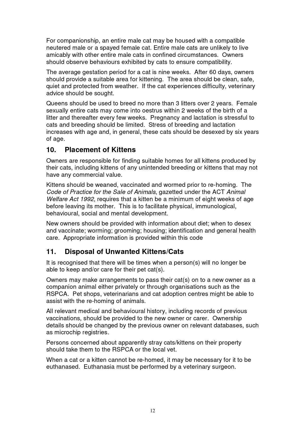 Владельцы ответственны за поиск подходящих домов для всех котят, которые рождаются у их кошек, включая внеплановых и не имеющих коммерческой ценности. Перед пристройством все котята должны быть приучены к потреблению твердой пищи, должны пройти вакцинацию и дегельминтизацию. Согласно Правилам торговли животными, составленным в соответствии с Законом о защите животных, действующим на территории федеральной столицы, котят можно отлучать от матери не ранее, чем по достижении ими восьминедельного возраста. Это необходимо для последующего нормального физического, иммунологического, эмоционального, социального развития котенка. Новому владельцу должна быть предоставлена информация о том, чем кормить, когда стерилизовать кошку, о прививках и дегельминтизации, об уходе за шерстью и содержании, об идентификации и профилактике заболеваний. Подобная информация содержится в данных правилах содержания.