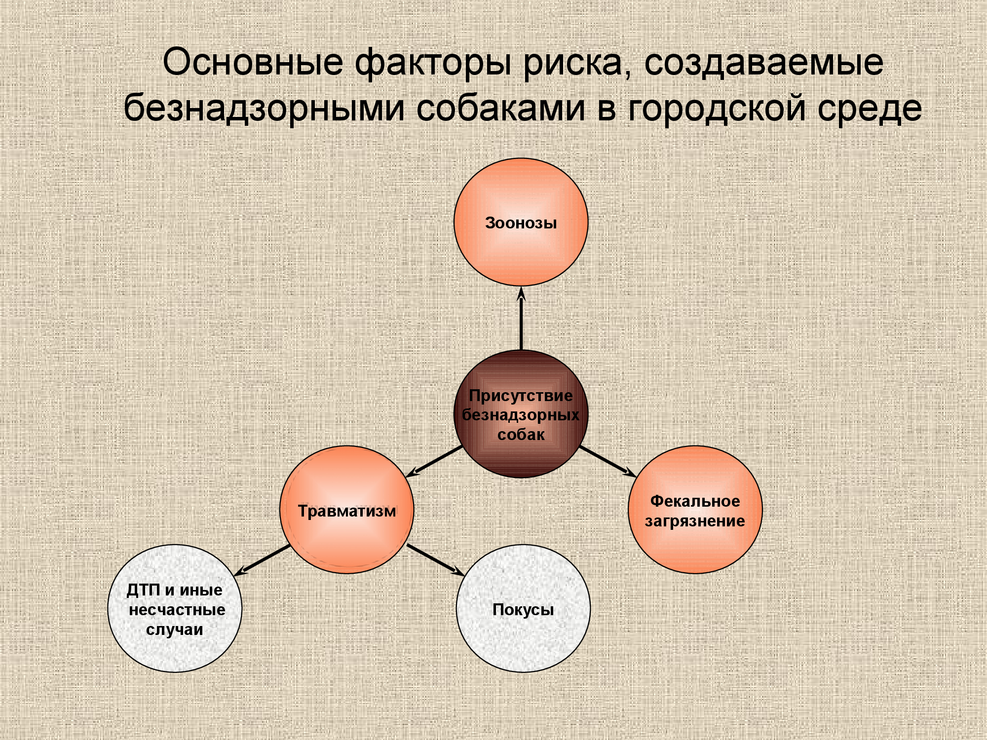 Как известно, присутствие безнадзорных животных (особенно собак) в населенных пунктах является одним из факторов риска; такие животные являются резервуаром ряда зоонозных инфекций и хозяевами паразитических организмов, опасных для человека. В случае безнадзорных собак дополнительным фактором риска является также возможность нанесения покусов людям, являющаяся одним из проявлений агрессивного поведения. (см.напр., (Beck, 75)).
