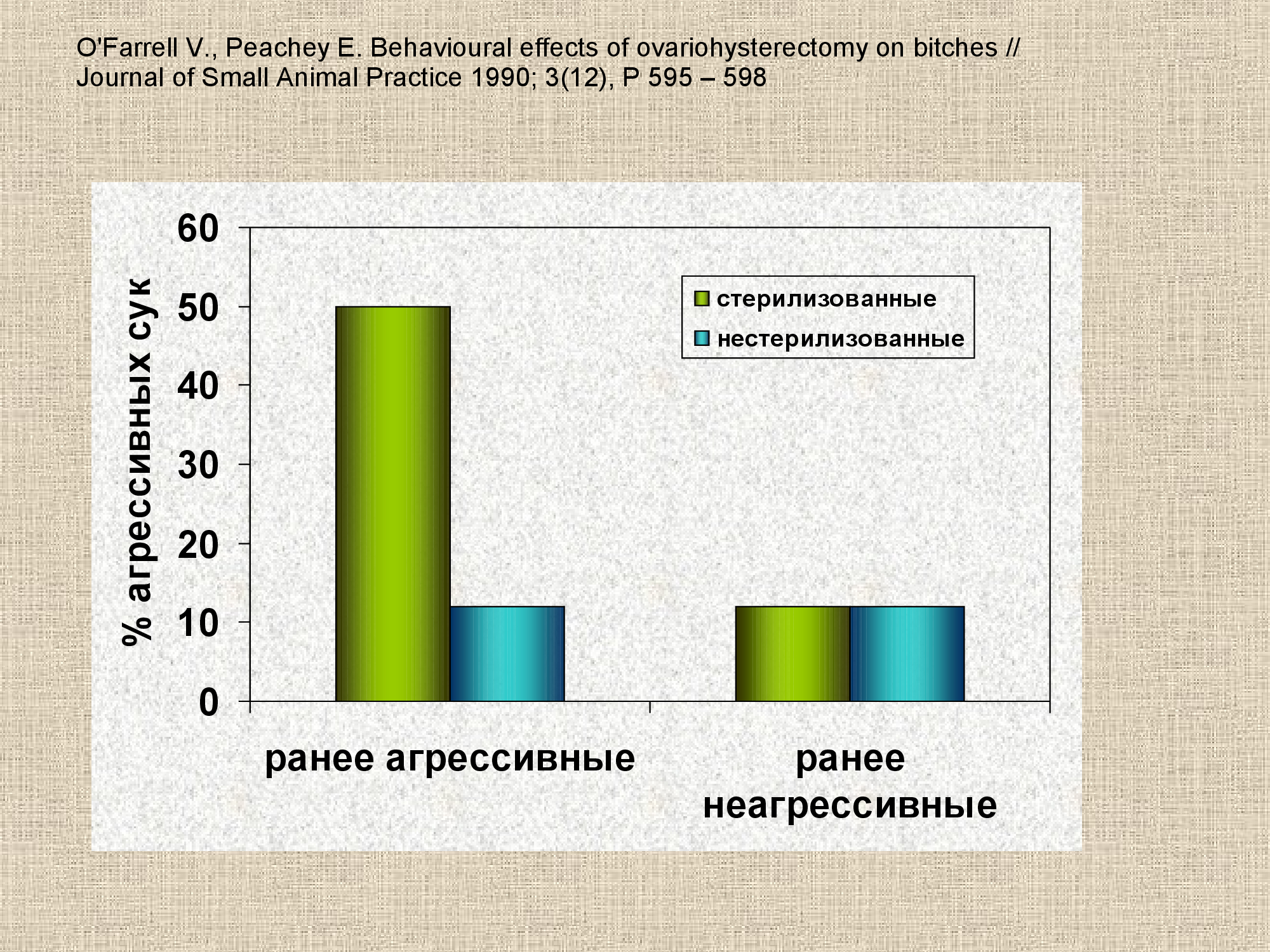 Дальнейшие исследования по этой теме (O'Farrell, 90) также подтверждают, что агрессивность (в частности, агрессивность доминирования) у кастрированных сук может возрастать; авторы работы заключают, что единственное бытовое неудобство, которого избегает владелец стерилизованной суки – это периодические течки. Особенно важно то, что достоверное возрастание частоты агрессии после кастрации (по сравнению с адекватным интактным контролем) наблюдалось не у всех самок – а лишь у тех, которые до операции также проявляли агрессию.