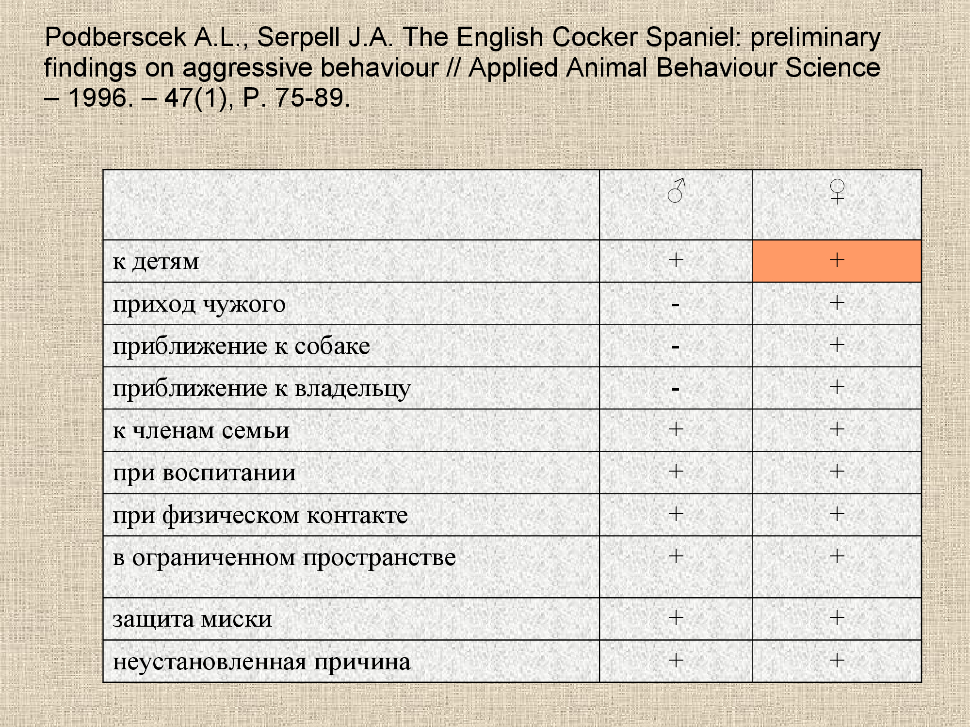 - Podberscek A.L., Serpell J.A. The English Cocker Spaniel: preliminary findings on aggressive behaviour // Applied Animal Behaviour Science – 1996. – 47(1), P. 75-89.