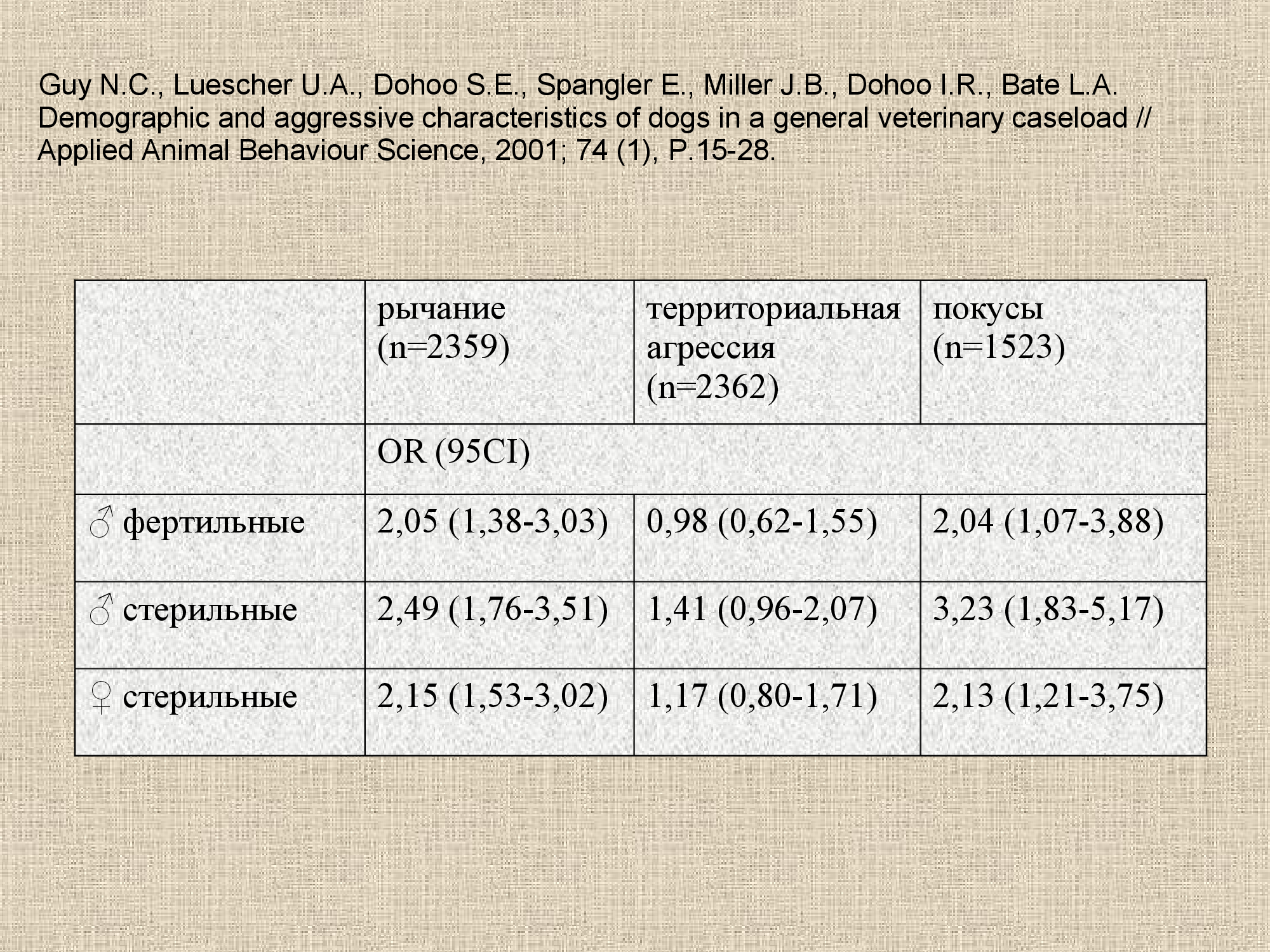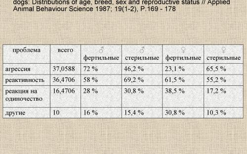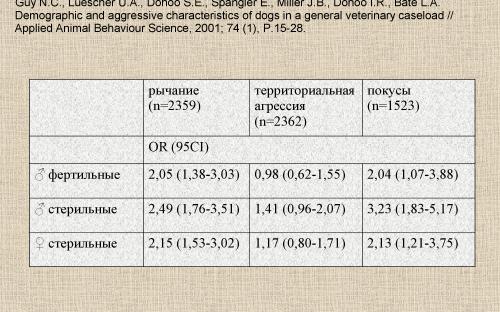 В последнее десятилетие было предпринято несколько попыток комплексного мультифакторного анализа значительных выборок животных на основании данных, полученных путем анкетирования владельцев. В одном из них, произведенном на основании анализа выборки, состоящей из более чем 3000 животных (Guy, 01), было показано достоверное повышение частоты агрессивного поведения у кастрированных сук (фактор риска по такому параметру, как рычание, составлял 2,15, при доверительном интервале 1,53-3,02; а по покусам, соответственно, 2,13 при доверительном интервале 1,21-3,75). Возраст и размеры животных не оказывали влияния на выявленные статистические закономерности.