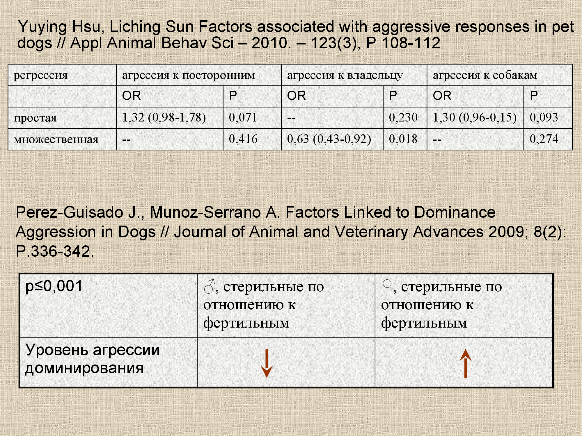 Третья попытка мультифакториального регрессионного анализа факторов, влияющих на агрессивность собак (Perez-Guisado, 09) опять показала наличие статистически достоверной зависимости между уровнем агрессии и репродуктивным статусом собаки. В частности, для кобелей было показано наличие ассоциации между кастрацией и снижением уровня агрессии – тогда как у сук опять была выявлена обратная статистически значимая закономерность.