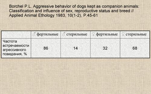 Действительно, в работе (Borchel, 83) было описано следующее явление: в группе кастрированных самцов частота проявлений агрессивного поведения была ниже, чем среди некастрированных особей – но при этом среди самок, наоборот, по уровню агрессии лидировали кастрированные суки.
