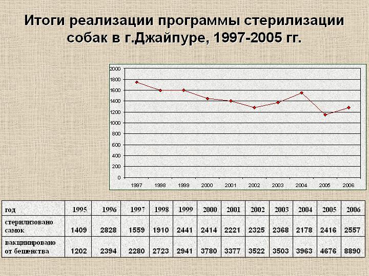 Согласно данным учета бездомных собак в исторической части г.Джайпура (Индия), достижение 65-70% охвата кастрацией самок привело к снижению общей численности собак на 28% в течение двух лет [5]. Однако результаты последующих наблюдений [6] свидетельствуют о прекращении снижения численности животных, и стабилизации ее на уровне около 70% от исходной, с незначительными флюктуациями из года в год.