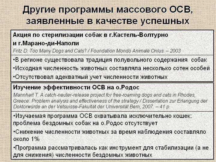 Перечисленные выше примеры применения ОСВ можно считать условно успешными. Как видно, их "успешность" сводится, в лучшем случае, к незначительному уменьшению числа бездомных животных, и стабилизации его на этом, достаточно высоком, уровне. Следует отметить, что количество животных, ежегодно прооперированных в рамках программы ОСВ, как правило, в несколько раз превышало численность взрослых животных, одномоментно обитающих на территории данного населенного пункта или учетной площадки [5-7]. Это, по-видимому, связано с постоянным воспроизводством популяции за счет оставшихся фертильными самок, а также за счет миграции; таким образом, поддержание необходимого процента кастрированных самок требует постоянных немалых усилий.