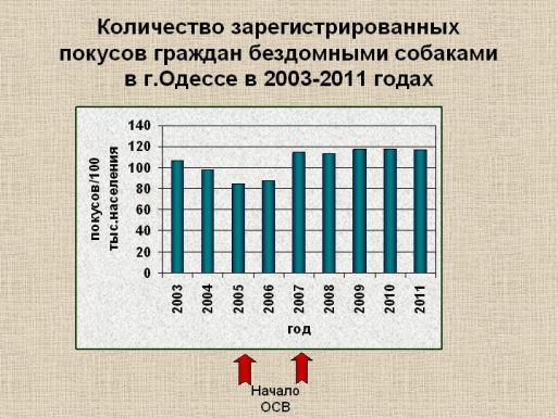 Таблица 1. Количество зарегистрированных покусов граждан бездомными собаками в г.Одессе в 2003-2011 годах, случаев на 100 тыс. населения: