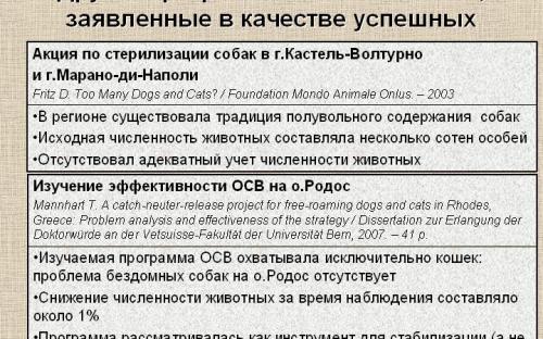 Еще один распространенный пример якобы успешного применения программы массового ОСВ – это деятельность итальянской организации Lega pro Animale в г.Кастель-Волтурно и г.Марано-ди-Наполи, Италия [8]. Однако как прямые, так и корректные косвенные данные учетов животных отсутствуют, вследствие этого, данный пример мы вынуждены исключить из рассмотрения.