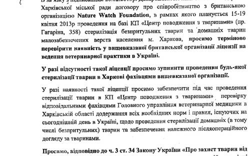 Перед этим, в феврале 2013 года между британской организацией FONATUREWATCHUNDATION и Харьковским городским советом было подписано соглашение о сотрудничестве, в рамках которого как раз и предполагалось провести акцию по бесплатной стерилизации домашних животных, спонсором которой согласились выступить британские коллеги. Предполагалось, что зарубежных ветеринаров будут приглашать каждые 3 месяца для проведения подобных акций. Цель каждого их приезда - не столько стерилизация 50-60 кошек и собак, сколько поппуляризация самой идеи стерилизации домашних животных, как самой эффективной и гуманной меры по сокращению числа бездомных четырехлапых бродяг.