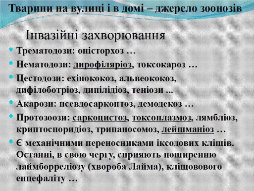 За масовістю – захворювання людей на паразитарні хвороби займають третє місце [1]. Нині встановлено паразитування в організмі людей близько 342 видів гельмінтів [7]. Більшість з цих паразитів властиві і для тварин. Територія України має сприятливі умови навколишнього середовища для широкого розповсюдження захворювань цієї групи. За даними паразитарного моніторингу протягом життя практично кожна людина нашої країни переносить якесь інвазійне захворювання, до того ж найчастіше від нього страждають діти. На долю школярів і дітей молодшого шкільного віку приходиться від 9 до 55% всіх хворих ентеробіозом, 61% – аскарозом [8].
