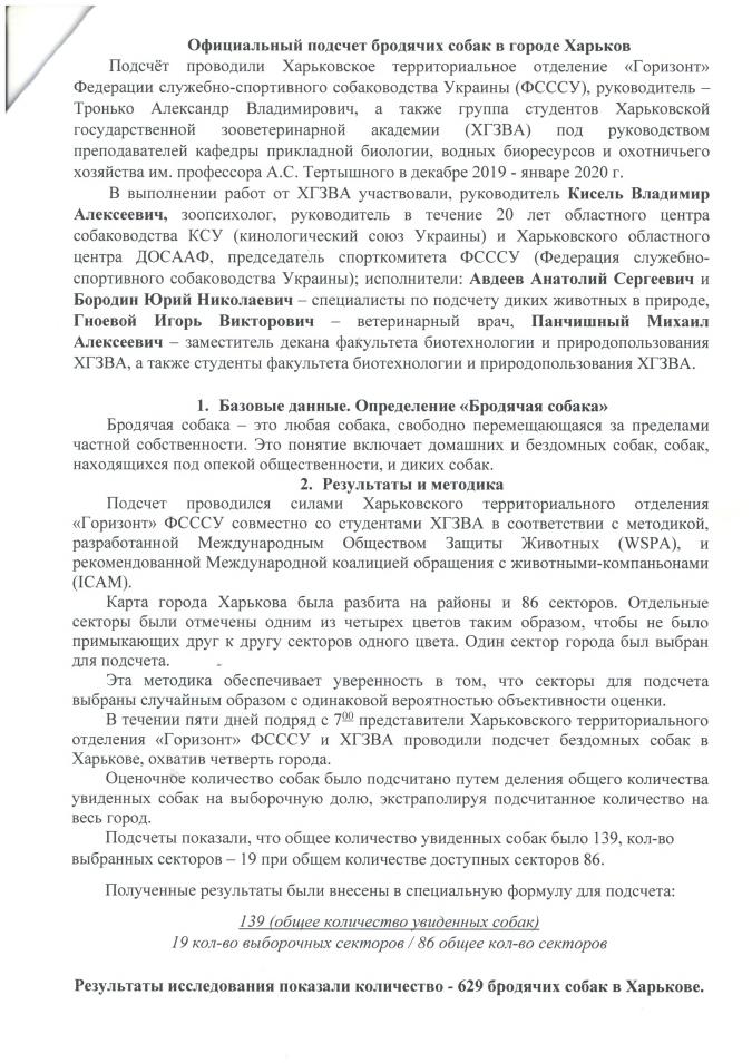 У грудні 2019 року силами виконавців підрахунку, а саме: кафедри прикладної біології, водних біоресурсів і мисливського господарства ім. професора А.С. Тертишного , Харківського територіального відділення «Горизонт» Федерації службово-спортивного собаківництва України, відповідно до методики, розробленої Міжнародним Товариством захисту тварин (WSPA), і рекомендованої Міжнародною коаліцією поводження з тваринами-компаньйонами (ICAM), що визнана в усьому світі, було проведено новий підрахунок безпритульних собак у Харкові.