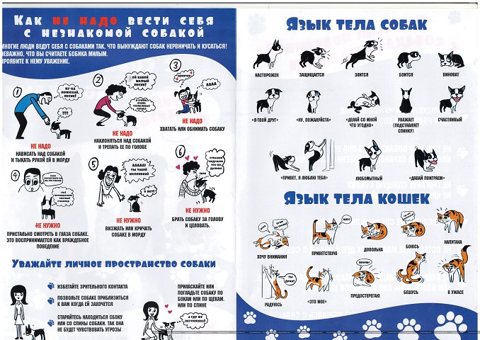 В КП «Центр обращения с животными» создали брошюру, в которой рассказывают детям, как правильно вести себя с домашними и бездомными животными. Также теме правильного обращения с четверолапыми было посвящено собрание, которое сотрудники приюта провели 18 ноября в общеобразовательной школе №79. В нем приняли участие инспекторы патрульной полиции, работающие по программе «Школьный полицейский», и учащиеся. По словам сотрудников центра, целью мероприятия было оказать методическую помощь офицерам полиции в формировании у школьников навыков бесконфликтного поведения с домашними и бездомными животными. В ходе встречи школьникам и полицейским раздали новые тематические брошюры.