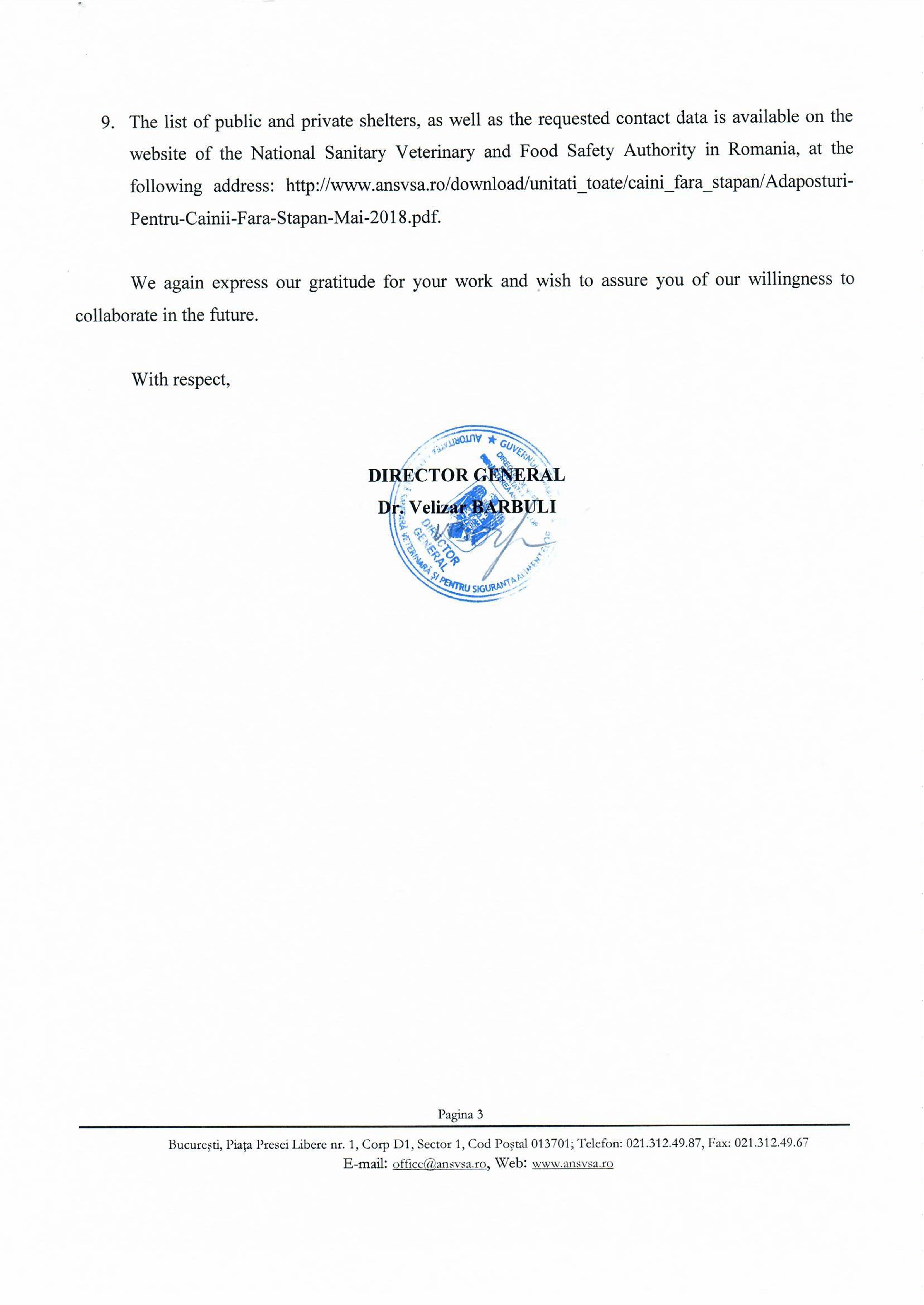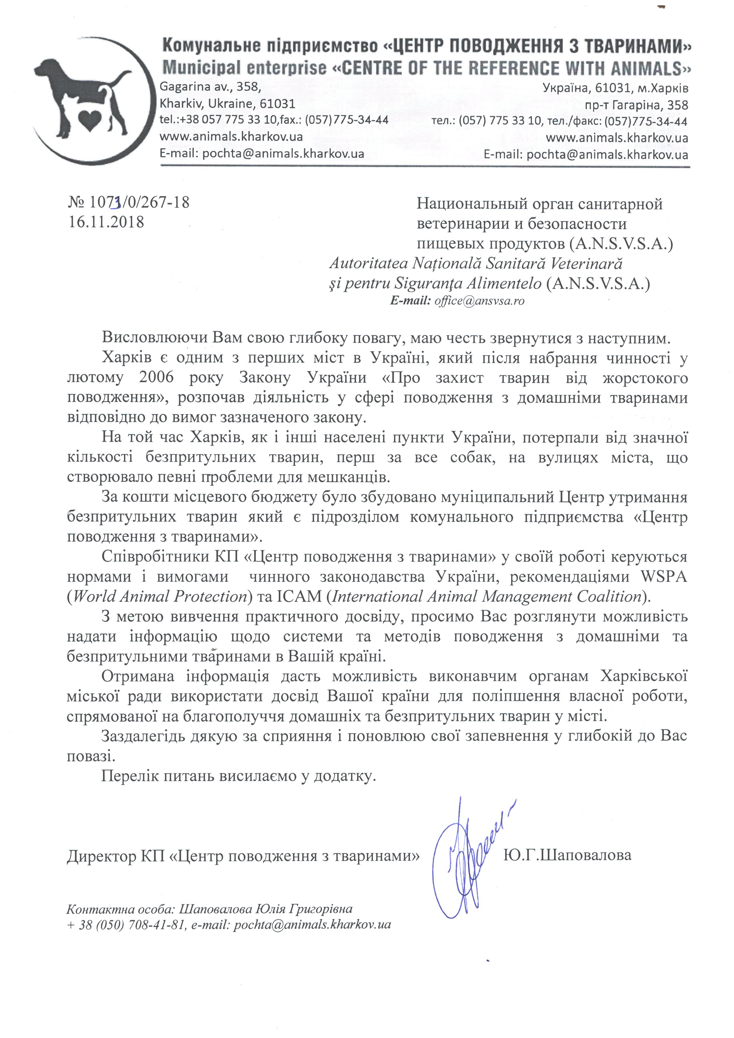 Национальный орган санитарной ветеринарии и безопасности пищевых продуктов в Румынии (N .SVFSA) с позиции центрального компетентного органа по вопросам защиты животных в Румынии хотел бы поблагодарить вас за ваши усилия по внедрению соответствующего национального и международного законодательства в области защиты животных и благополучия в Харькове (Украина).
