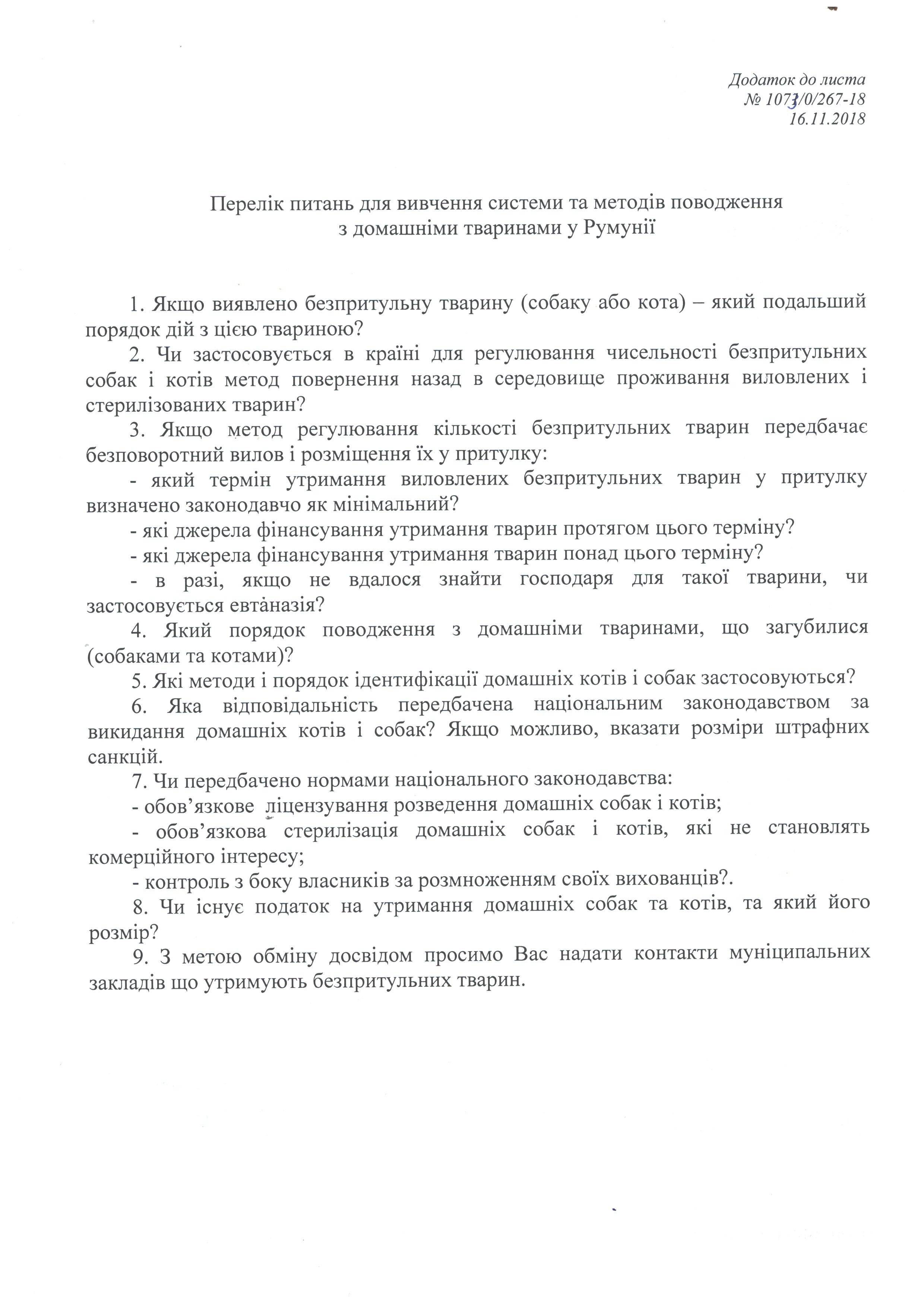 КП "Центр обращения с животными" на свой запрос получило ответ центрального компетентного органа по вопросам защиты животных в Румынии - Национального органа санитарной ветеринарии и безопасности пищевых продуктов в Румынии (N .SVFSA).