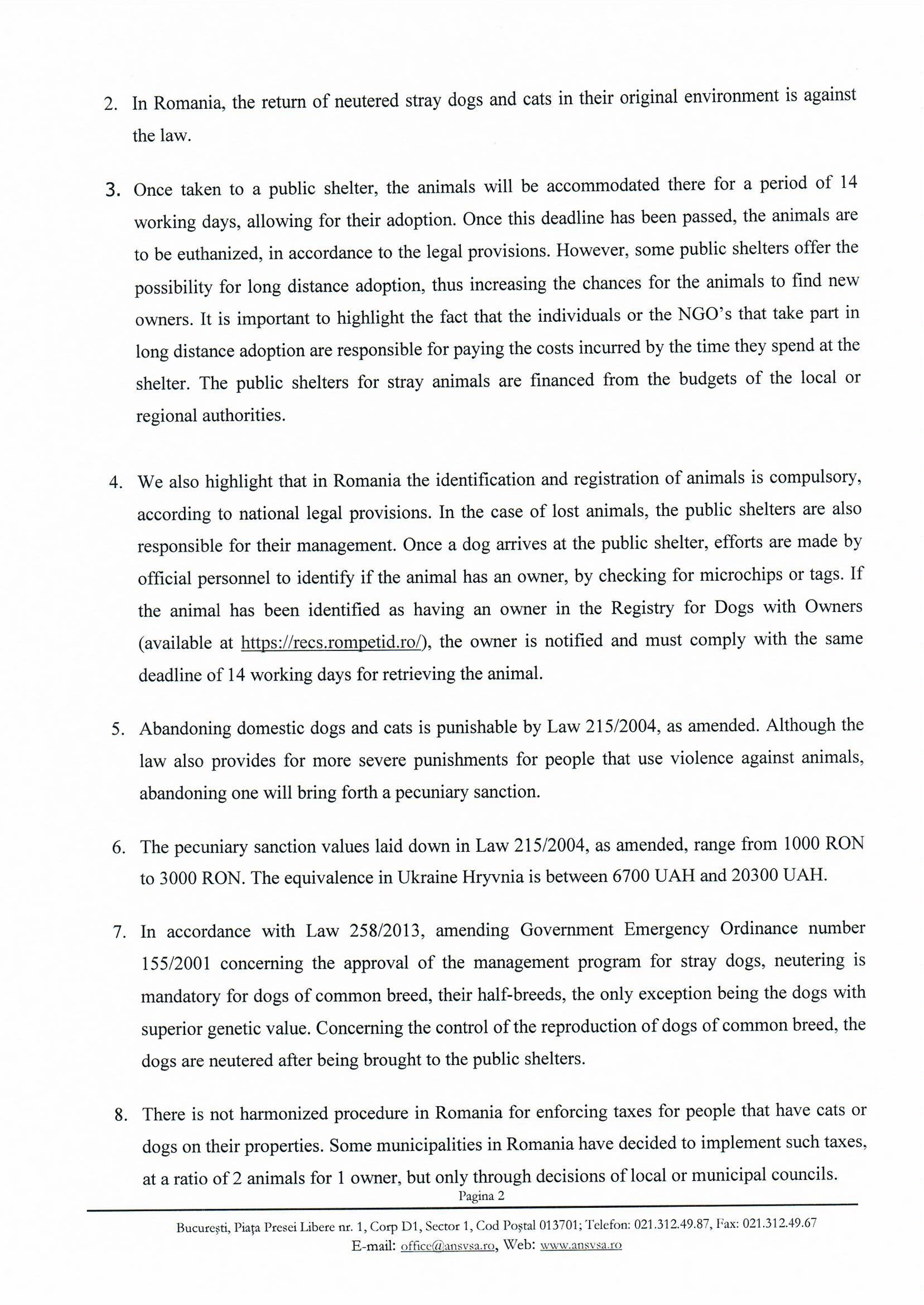 4. Мы также подчеркиваем, что в Румынии идентификация и регистрация животных является обязательной в соответствии с национальными правовыми положениями. В случае потери животного, государственные приюты также несут ответственность за поиск их хозяев. Если собака попадает в государственный приют, его персонал должен определить, есть ли у животного владелец, путем проверки наличия микрочипов или бирок. Если животное было идентифицировано как имеющее владельца в Реестре собак (доступно по адресу ссылка), об этом уведомляют владельца, который должен забрать свое животное не позднее 14 рабочих дней.