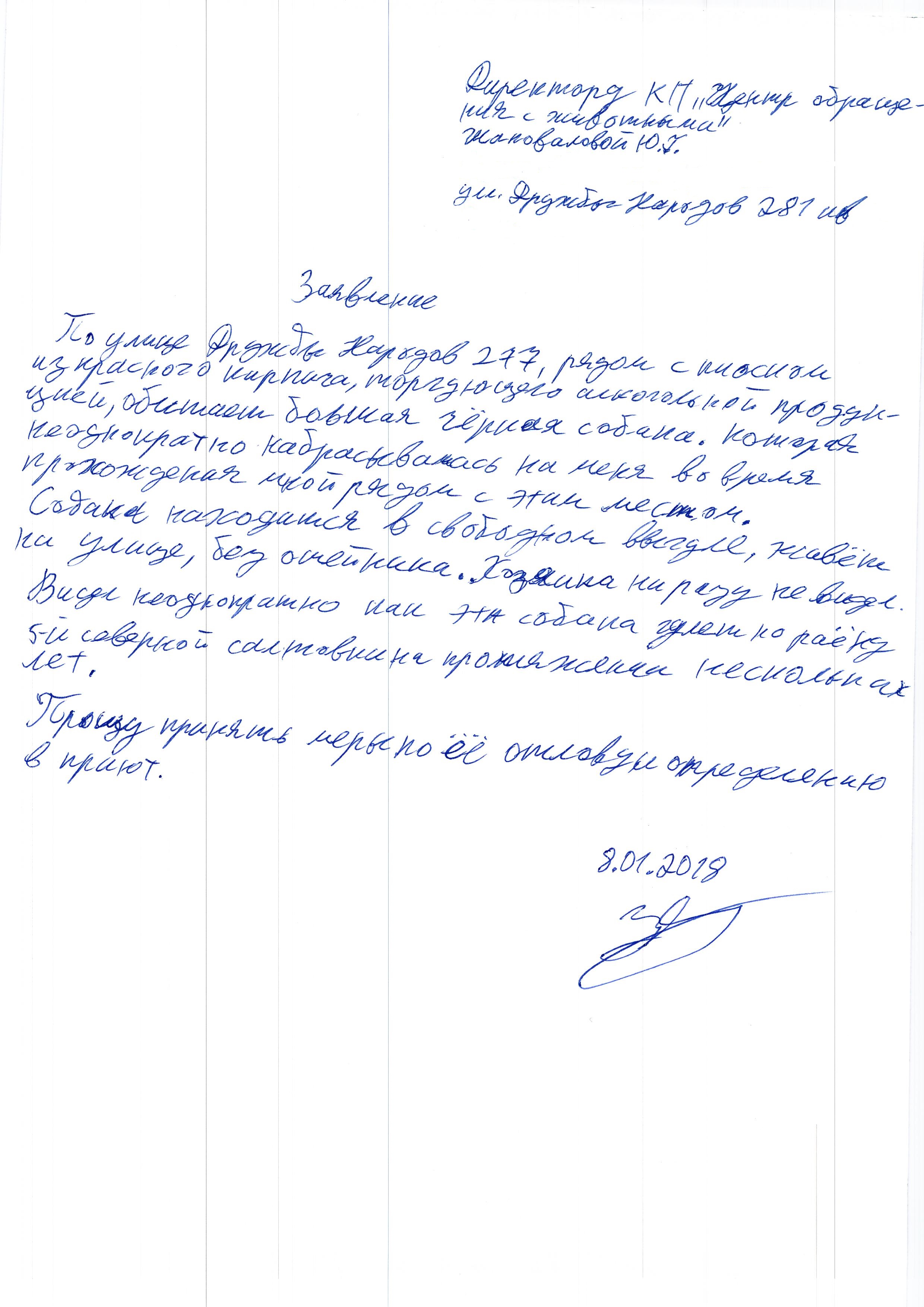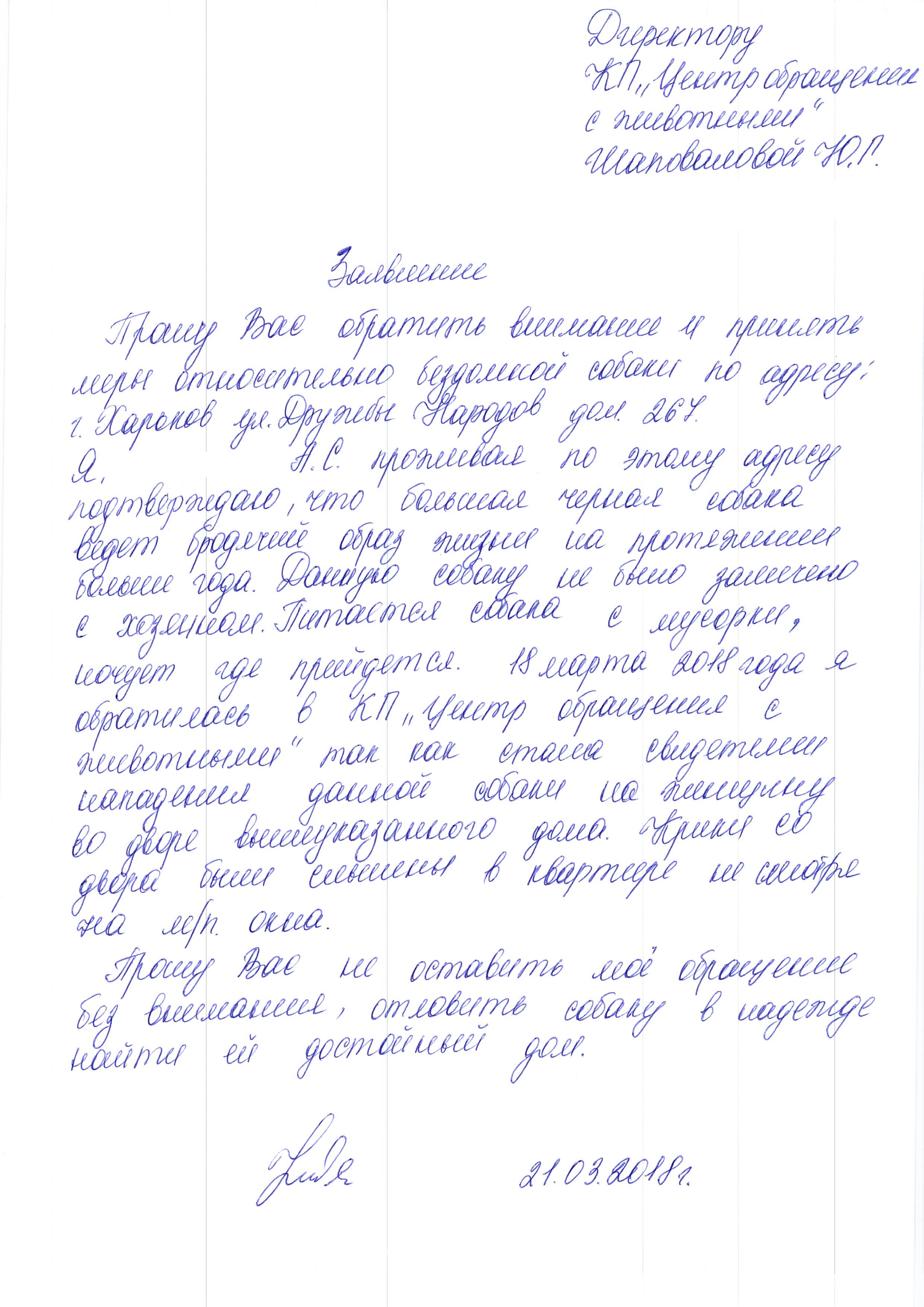 В период с 3 января по 8 мая 2018 диспетчеру КП поступали звонки с жалобами на одну конкретную собаку. Взрослый кобель черного окраса, размером выше среднего проявлял агрессию по отношению к жителям двора. А именно: рычал, скалился на людей, и в итоге покусал ребенка и двух женщин. Он обитал во дворах между домами 277 и 267 по улице Дружбы народов. По «Правилам содержания домашних животных в Харькове», собака в свободном выгуле, то есть без ошейника и повода, подлежит отлову. ( Правила можно скачать и прочитать по ссылке http://www.1562.kharkov.ua/ru/article/rishennya-harkivskoyi-miskoyi-radi... )