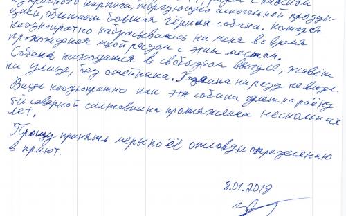 Возникают логические вопросы: Что собака столько времени делает на улице? Почему жильцы дома наблюдают собаку без присмотра человека на протяжении 1,5-2 лет? На каком основании она оставляет собаку без присмотра?
