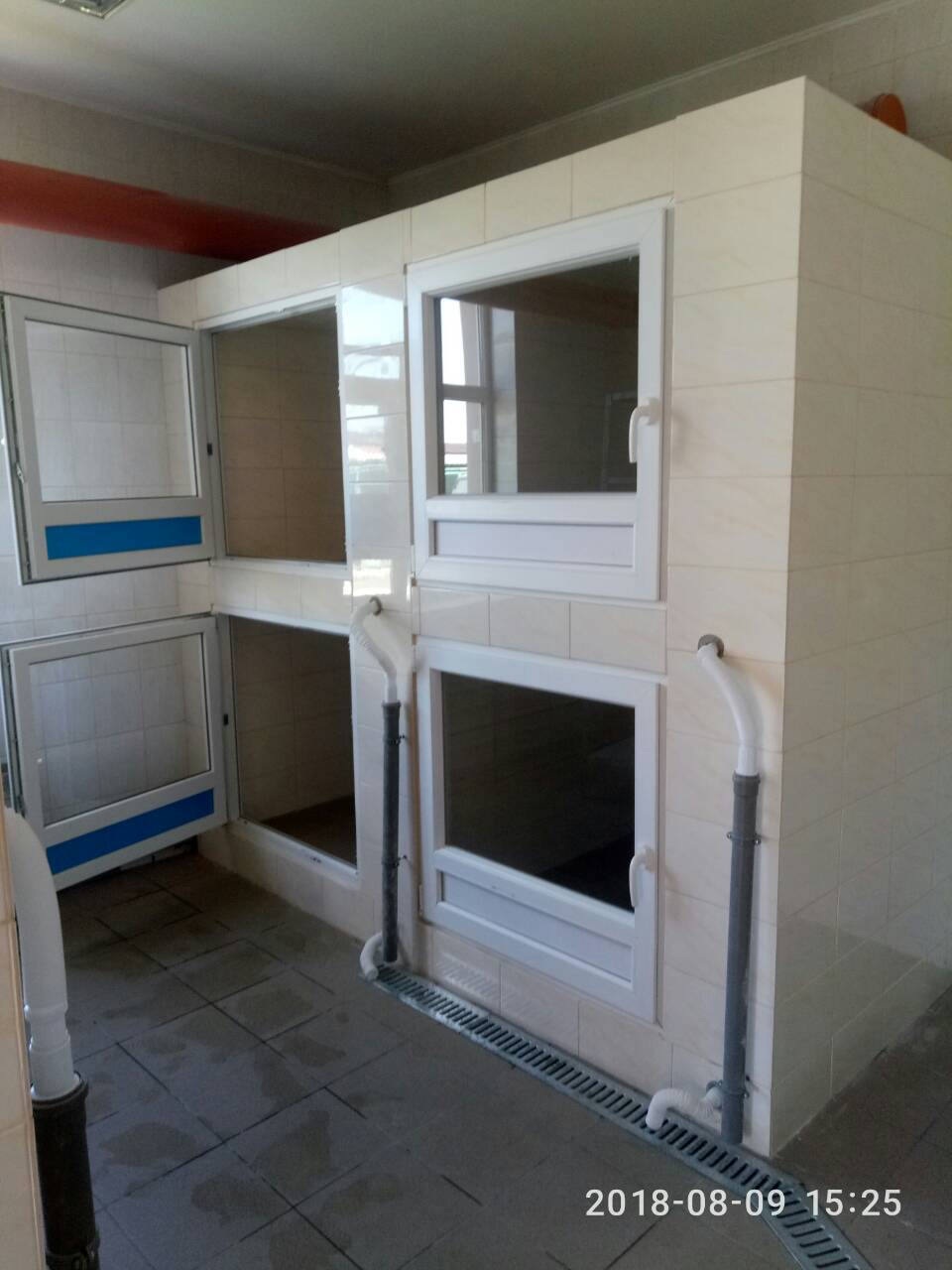 На этот раз - в зоне карантина - были оборудованы боксы для содержания щенков и короткошерстных собак. Боксы размещены в отапливаемом помещении зоны карантина, оборудованы вентиляцией и системой водоотведения и выполнены с учетом необходимости их частого мытья и дезинфекции.
