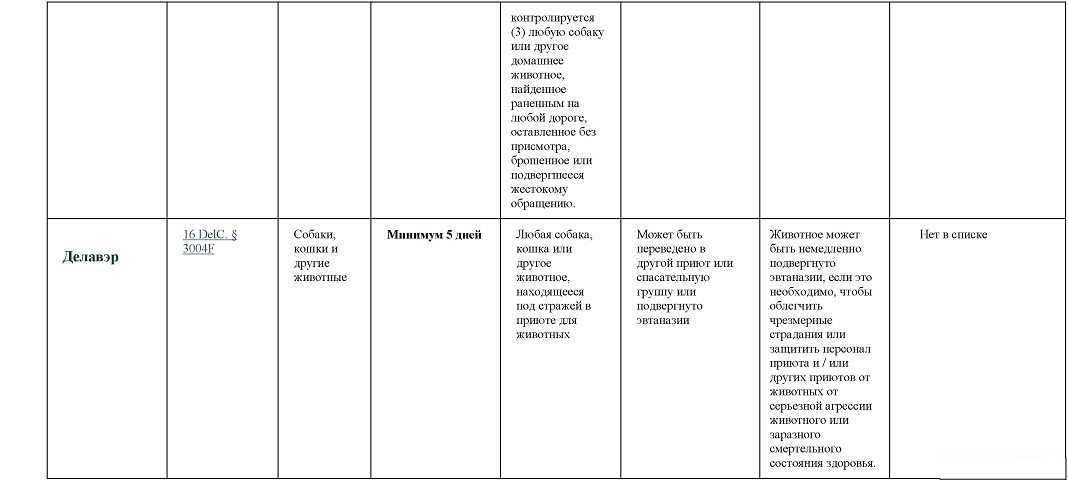 Законы в этой таблице отражают законы о сроке содержания животных, конфискованных органами государственной власти. В зависимости от государства это не может распространяться на животных, добровольно сданных владельцами. Таблица также не охватывает животных, конфискованных в рамках расследования жестокости или пренебрежения, поскольку для этого процесса часто существуют отдельные законы. Кроме того, эти законы могут не применяться к частным (негосударственным субъектам) партиям и организациям, занимающимся беспризорными или брошенными животными. В некоторых штатах и местных юрисдикциях эти лица могут требовать, чтобы эти люди передали собаку в приют или сообщали о бездомном животном, чтобы владелец мог связаться с общественным приютом, чтобы вернуть потерянное животное. Наконец, эта таблица касается только домашних животных (собак и кошек) и не охватывает проблему «estrays» - законов, касающихся домашнего скота на свободе.