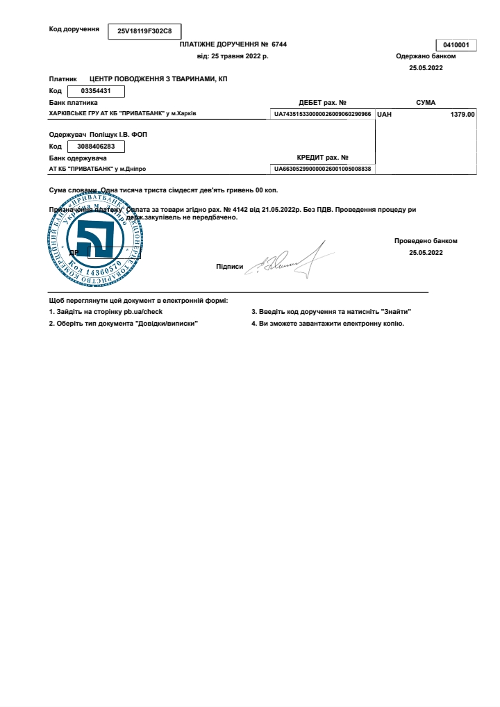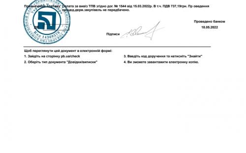 27.04.2022р. - сплачено за ветеринарні препарати та медичні матеріали 26 534 грн