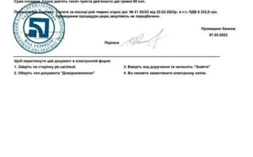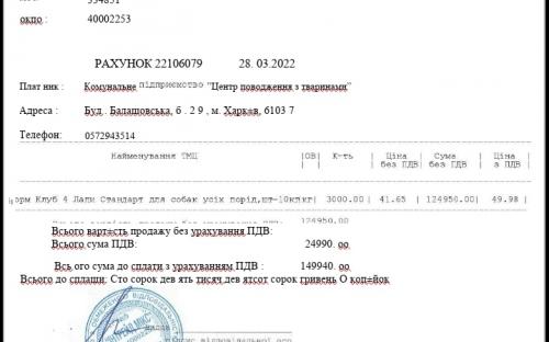 07.03 було сплачено за корм, компанія Сузір‘я м.Харків 49 392грн.;