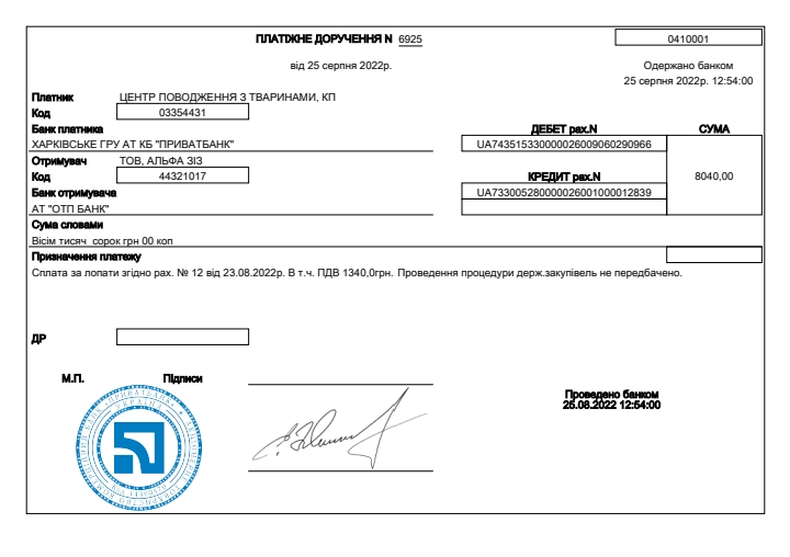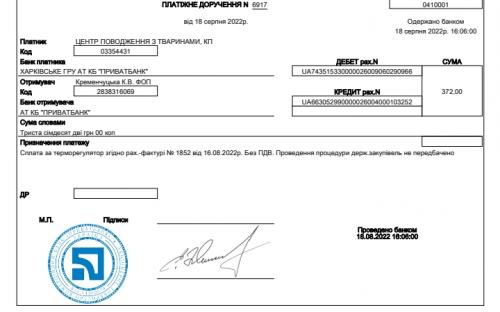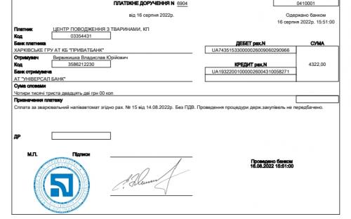 Звіт з надходження благодійних коштів та витрат підприємства серпень 2022р.