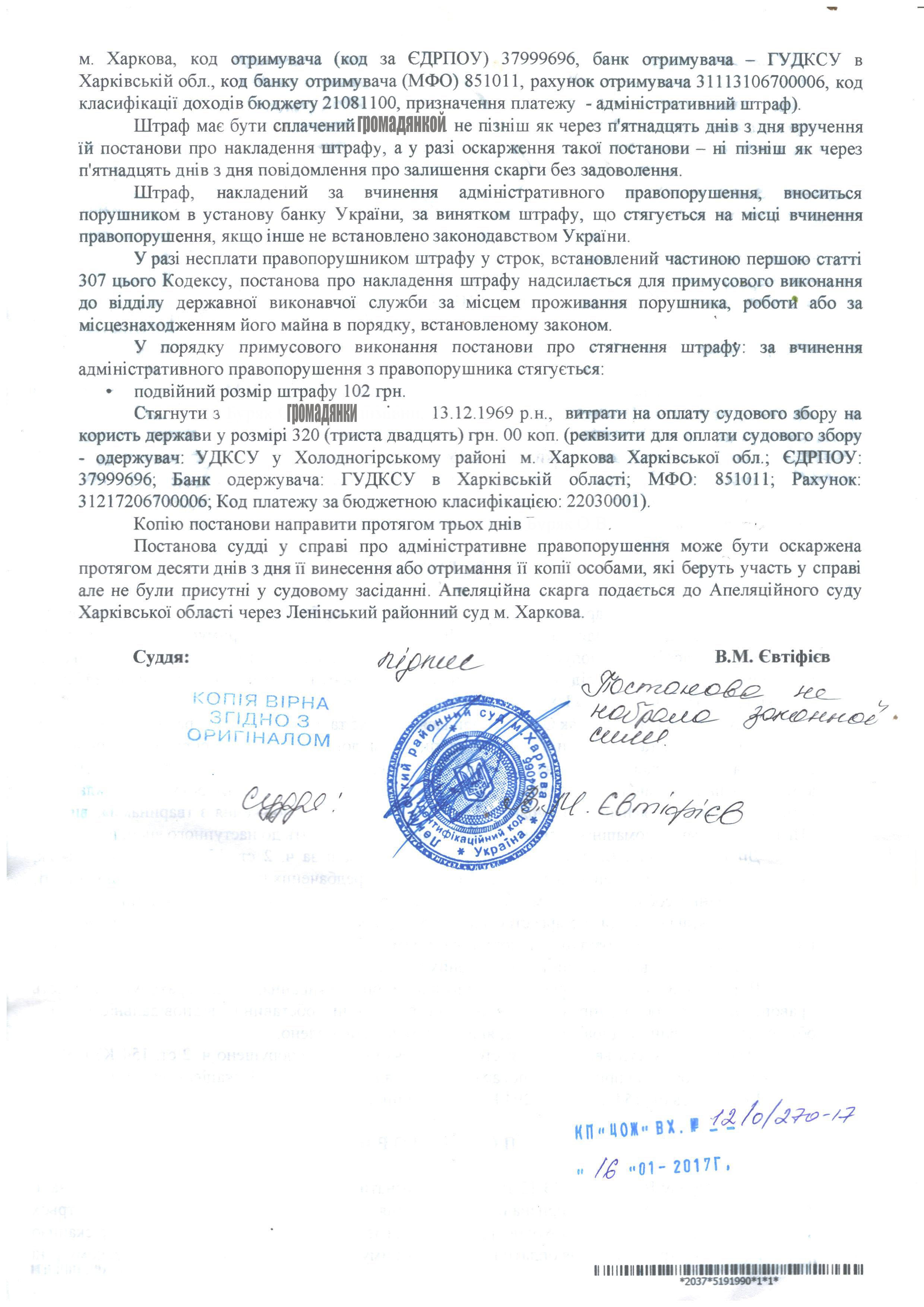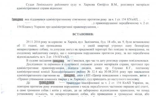 Ленинский районный суд рассмотрел дело о административном правонарушении по ст.154 часть 2. И вынес решение о наложение штрафа и конфискации собаки. Этому предшествовали многочисленные жалобы от соседей на нарушение "Правил содержание домашних животных в городе Харькове"