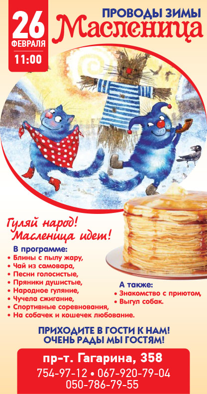 26 числа в воскресенье КП "Центр обращение с животными" приглашает провести самое любимое народное гулянье масленица. Ждем вас по адресу Гагарина 358 начало в 11-00.
