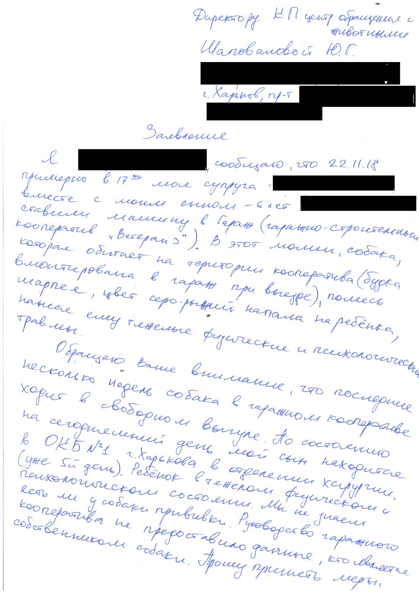 Сегодня КП "Центр обращения с животными" стало известно, что 22 ноября 2018 г. собака, обитающая на территории гаражного кооператива "Ветеран-3", расположенного по адресу: г. Харьков, пр.Гагарина, 201, нанесла покус шестилетнему мальчику.