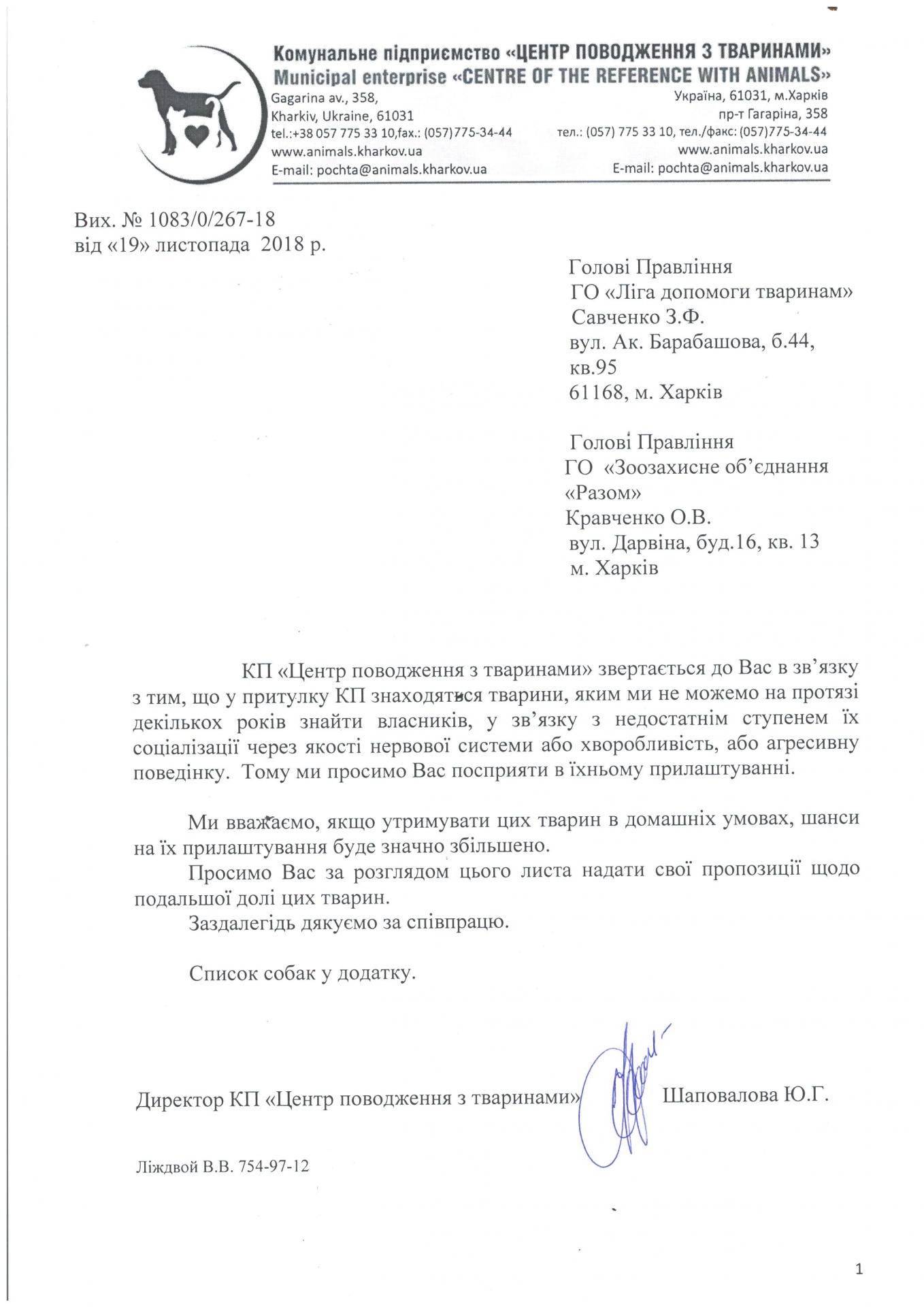 КП "Центр обращения с животными" обращается к председателям правления зоозащитных общественных организаций "Лига помощи животным" Савченко З.Ф. и "Зоозащитное объединение "Вместе" Кравченко Е.В.