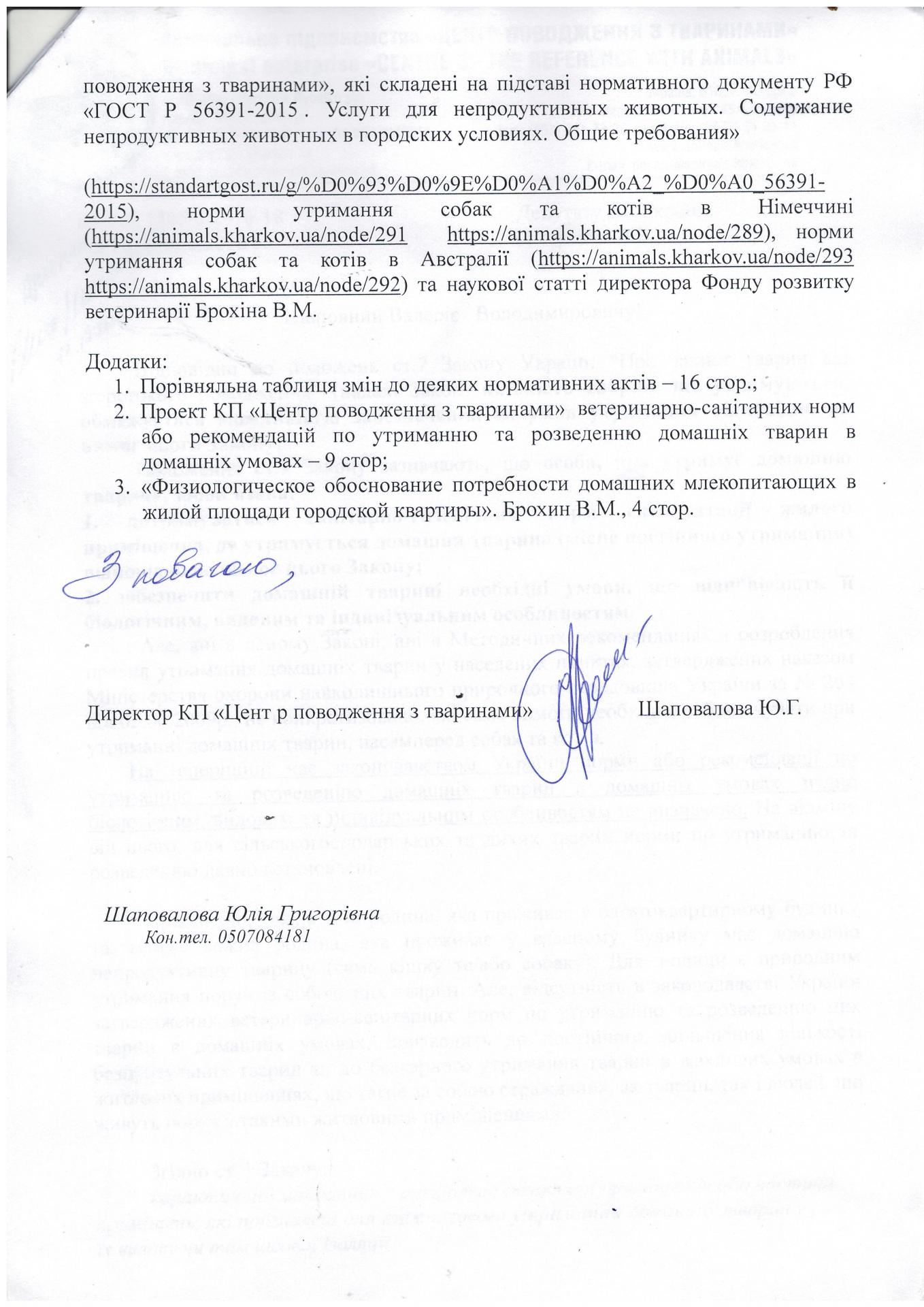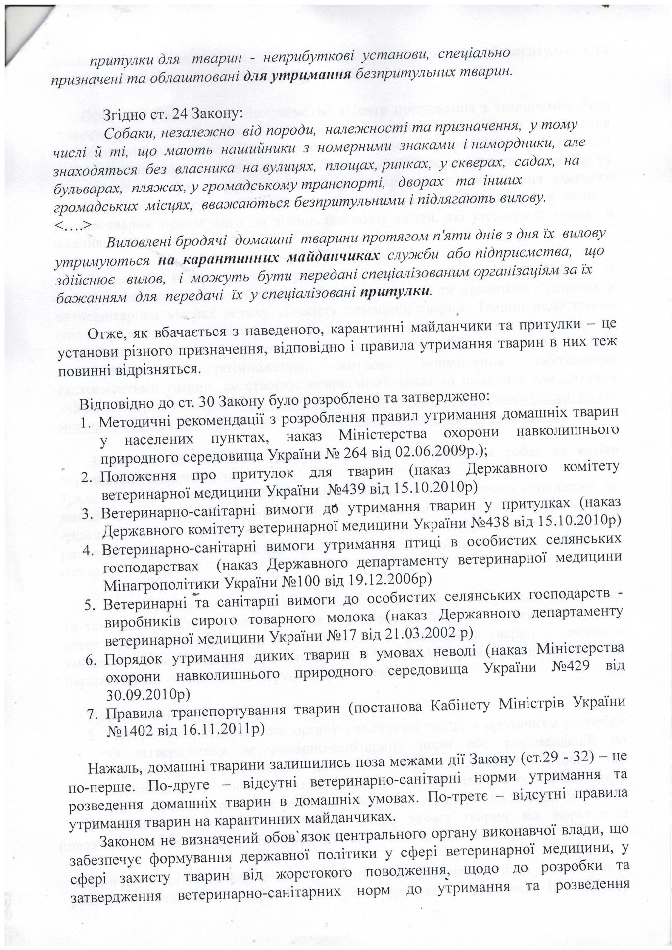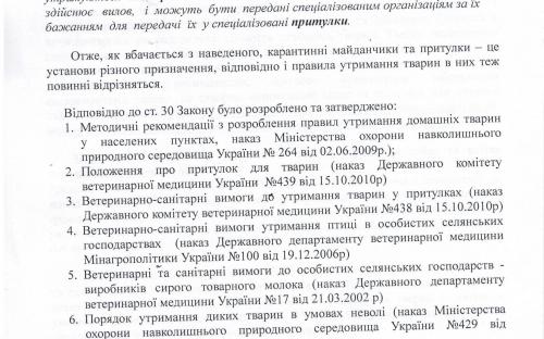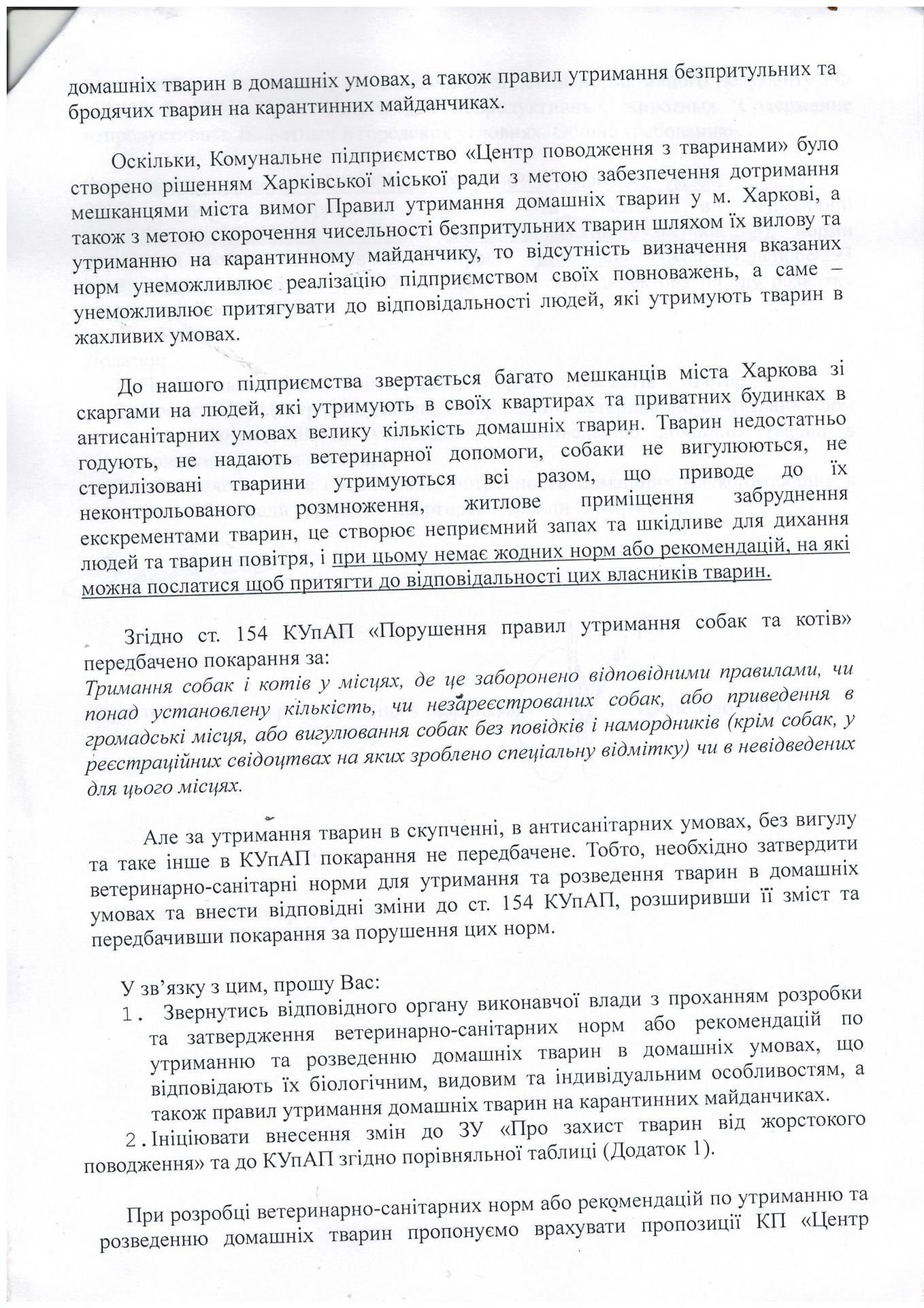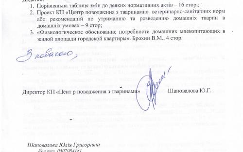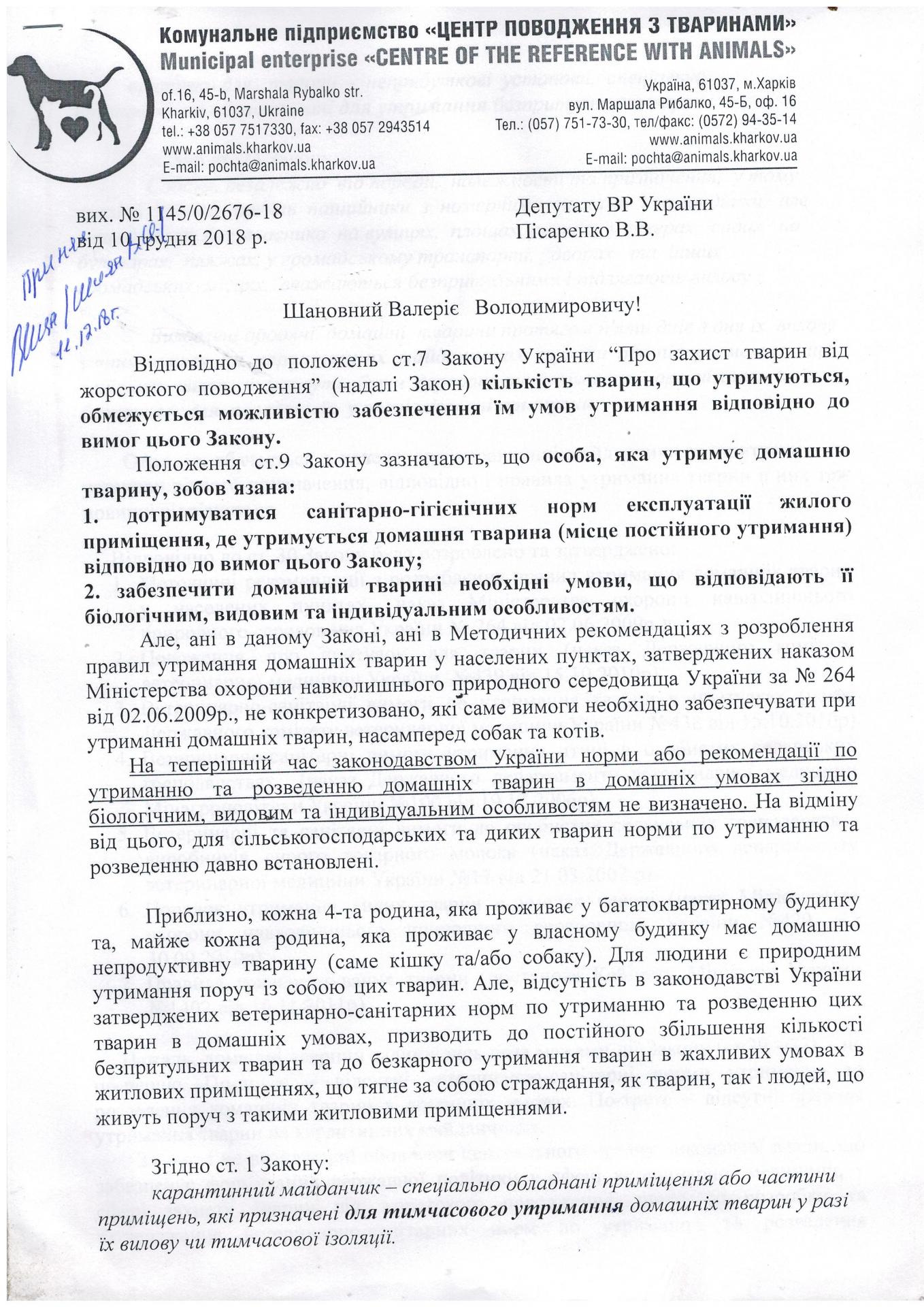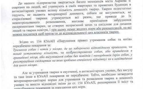Поэтому, КП «Центр обращения с животными» подало субъекту законодательной инициативы – народному депутату Писаренко В.В. - письмо с просьбой обратиться в соответствующий орган исполнительной власти для разработки и утверждения ветеринарно – санитарных норм или рекомендаций по содержанию и разведению домашних животных в домашних условиях, которые соответствуют их биологическим, видовым и индивидуальным особенностям, а также правил содержания домашних животных на карантинных площадках. Инициировать соответствующие изменения в Закон Украины «О защите животных от жестокого обращения» и Кодекс Украны об административных правонарушениях. Кроме того, народному депутату было предложено при разработке ветеринарно – санитарных норм и рекомендаций учесть предложения КП «Центр обращения с животными».