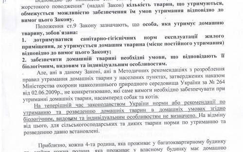 В настоящее время в законодательстве Украины отсутствуют ветеринарные, санитарные и гигиенические нормы, рекомендации или стандарты по содержанию и разведению домашних животных согласно их видовым, индивидуальным и биологическим особенностям.