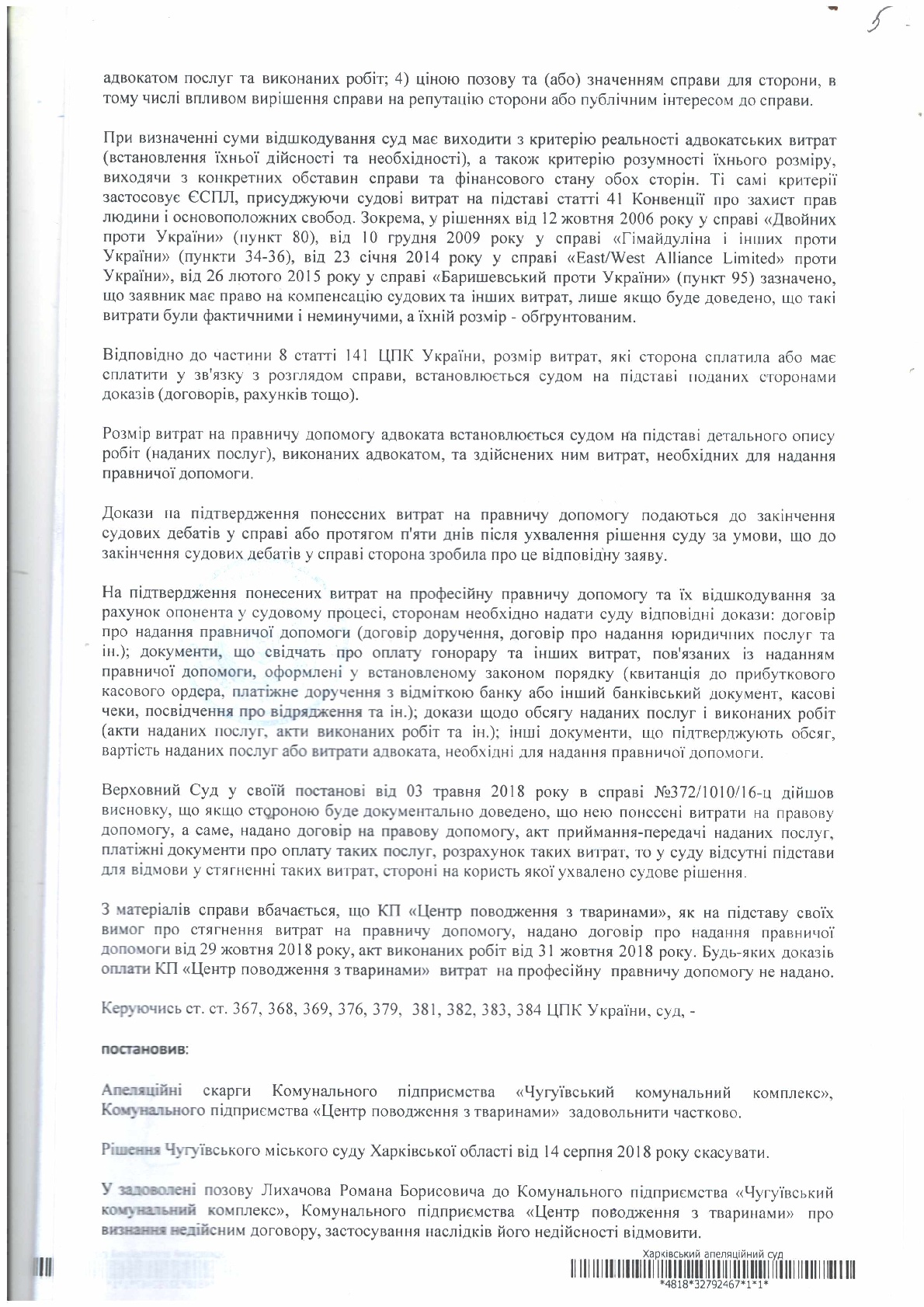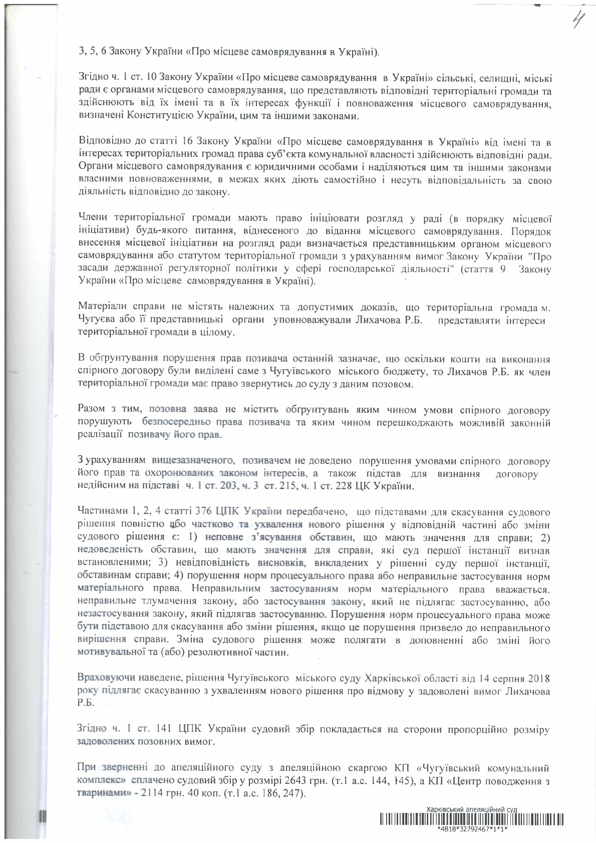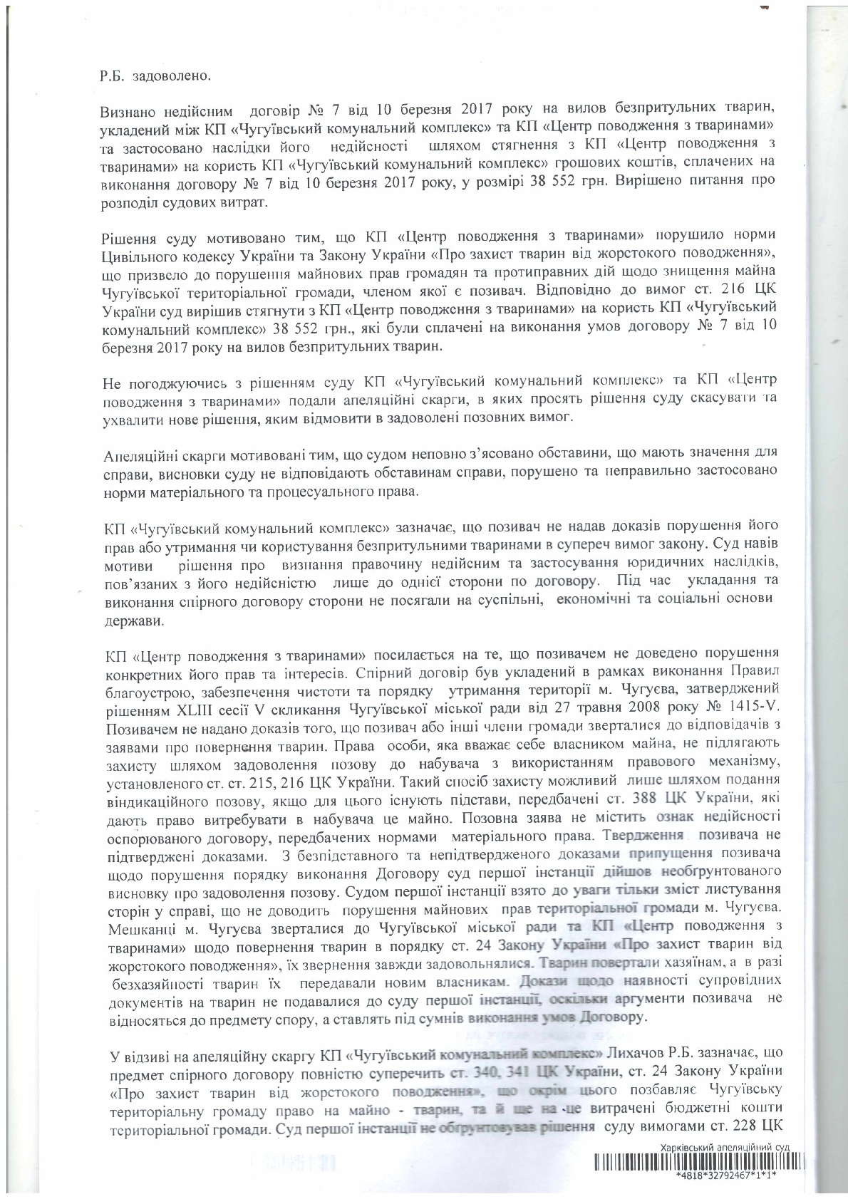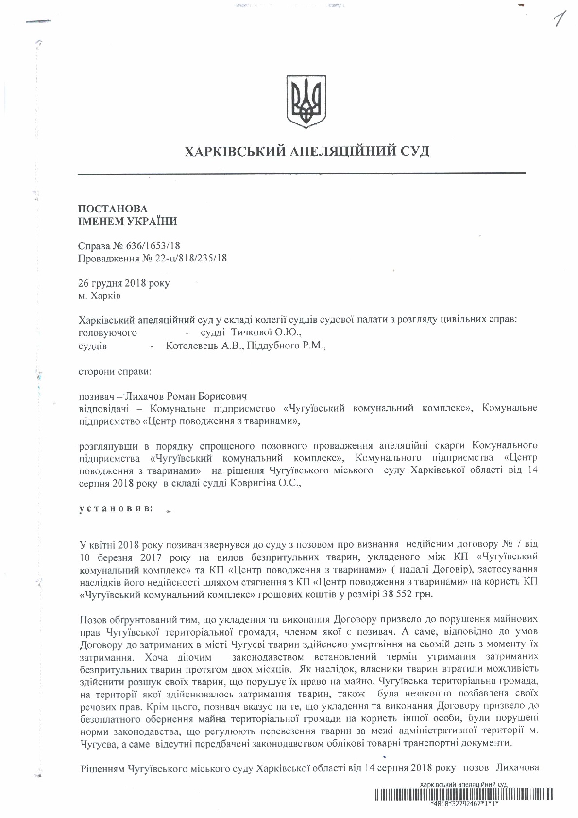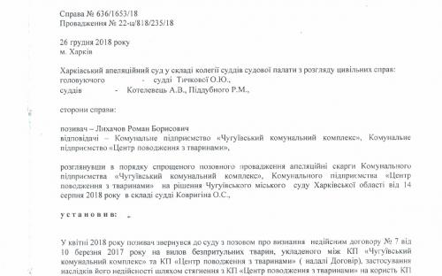 26.12.2018 г. постановлением Харьковского апелляционного суда отменено широко "разрекламированное в узких кругах" решение Чугуевского городского суда от 14.08.2018 г. по иску якобы правозащитника Лихачева Романа Борисовича к Коммунальному предприятию «Чугуевский коммунальный комплекс» и Коммунальному предприятию «Центр обращения с животными» о признании недействительным Договора №7 от 10.03.2017 года об отлове беспризорных животных.