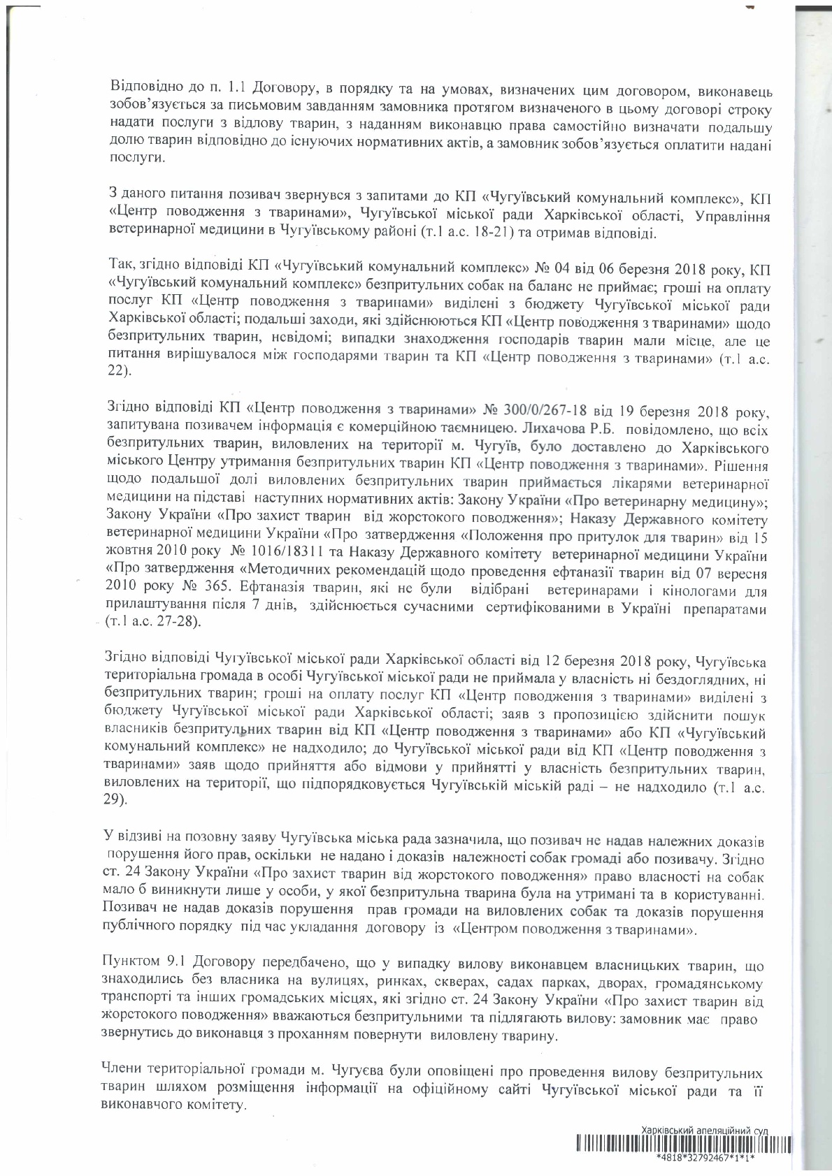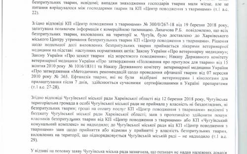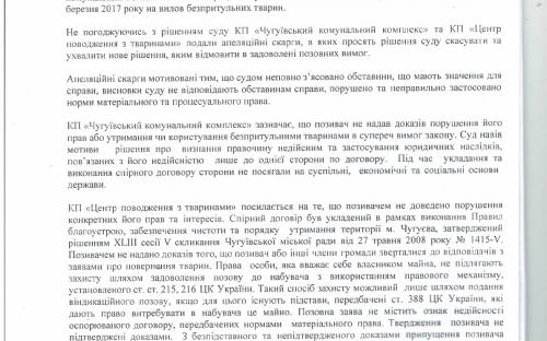 А предыстория данного решения такова. 24.04.2018 года Лихачев Роман Борисович подал иск в Чугуевский городской суд к Коммунальному предприятию «Чугуевский коммунальный комплекс» и Коммунальному предприятию «Центр обращения с животными». По мнению истца, заключенный предприятиями Договор №7 от 10.03.2017 года об отлове беспризорных животных, нарушил его права как члена общины города Чугуева. В результате исполнения Договора якобы было уничтожено имущество территориальной общины г. Чугуева, которым, по мнению истца, являлись бездомные собаки, обитающие на территории города. При этом, в ответах суду Чугуевского городского совета и КП «Чугуевский коммунальный комплекс» указано, что бездомные и беспризорные животные ими на баланс не принимались и собственностью территориальной общины не являются.