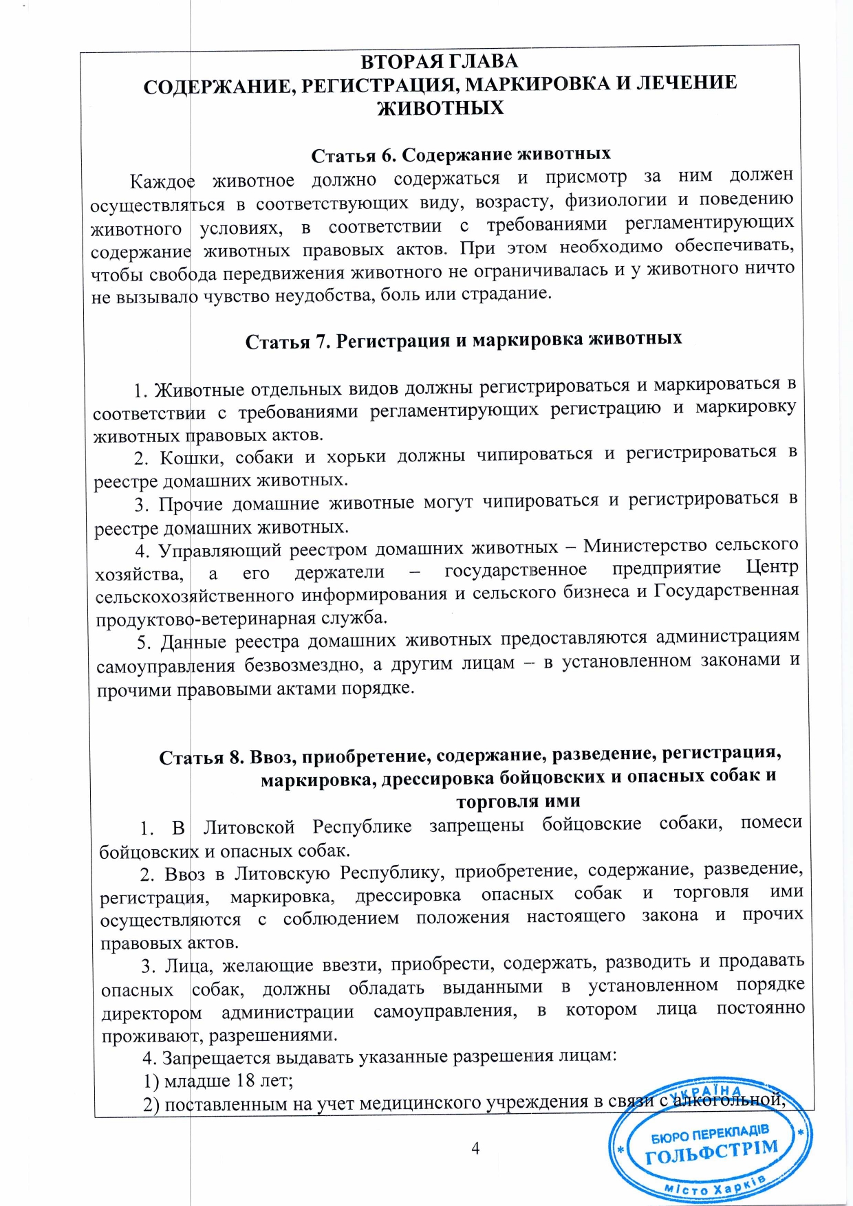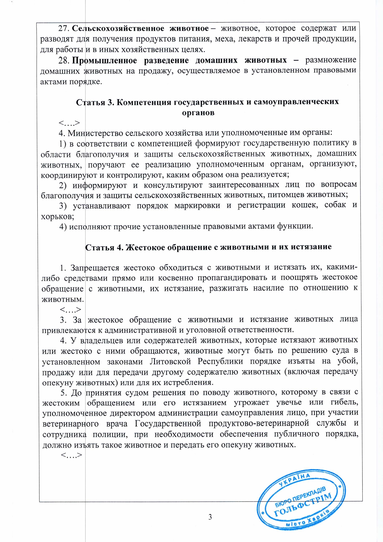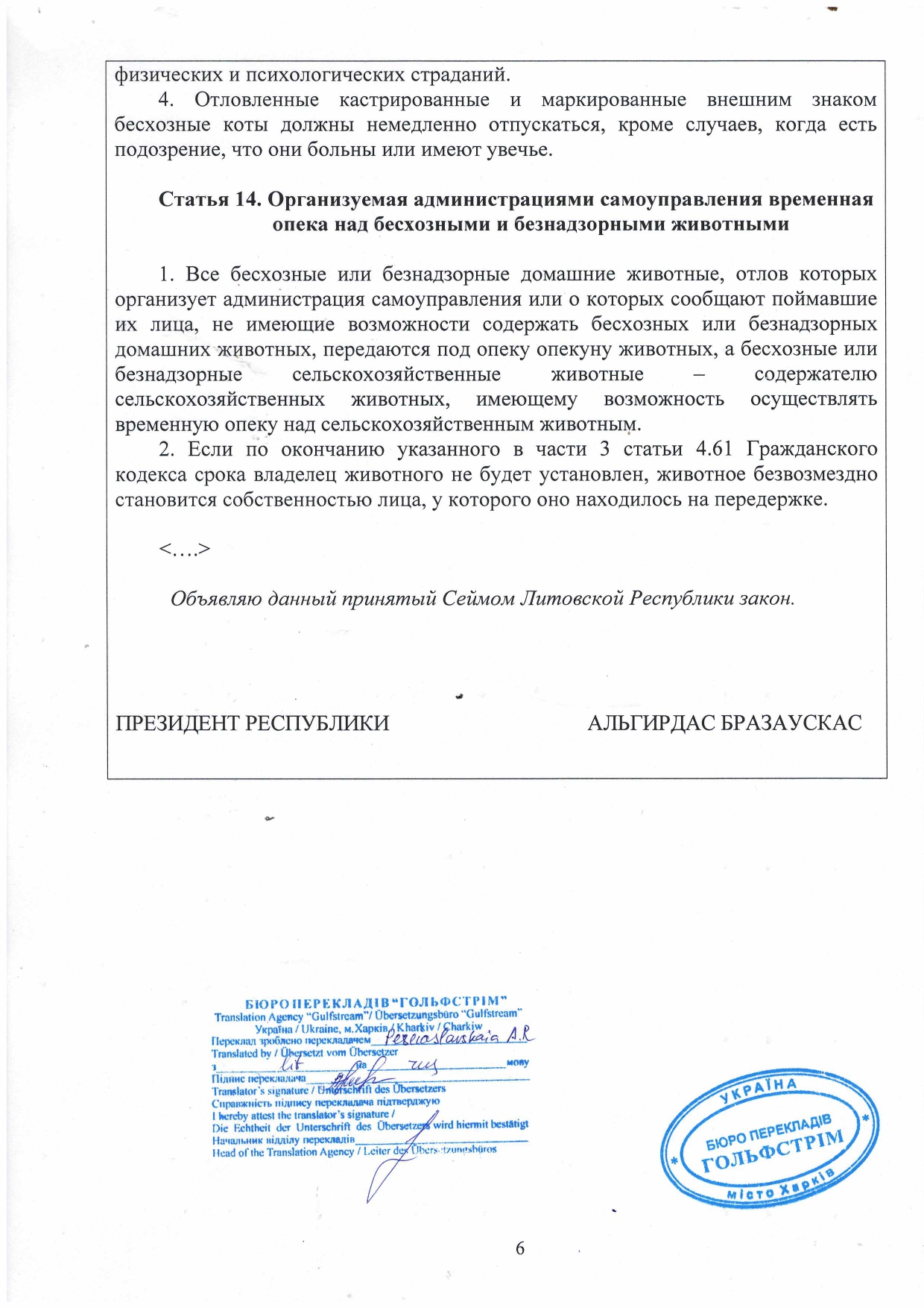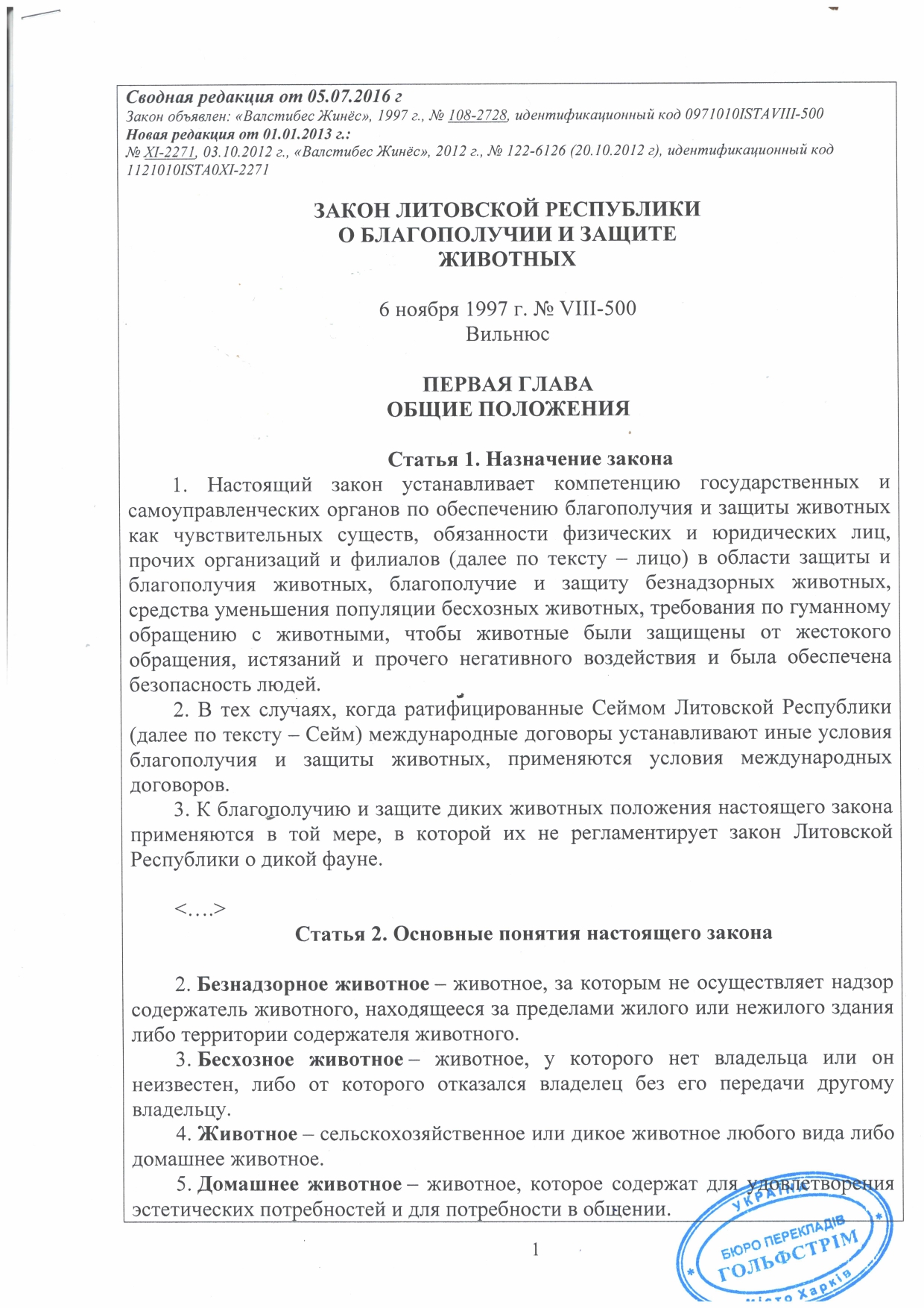 Оригинал Закона Литовской Республики " О благополучии и защите животных".