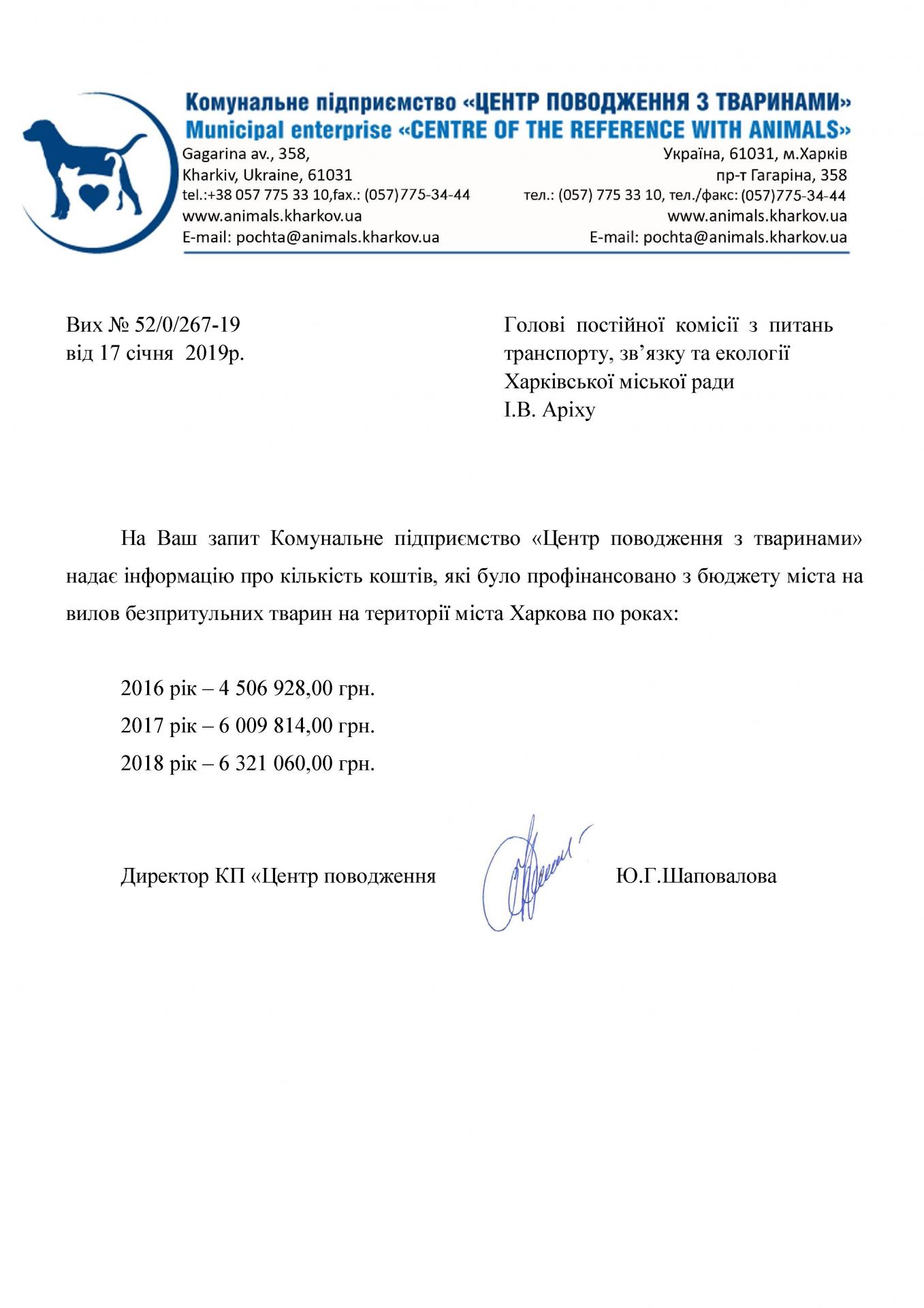 КП "Центр обращения с животными" предоставляет информацию о количестве средств, которые были профинансированы из бюджета города на отлов беспризорных животных на территории г. Харькова по годам: