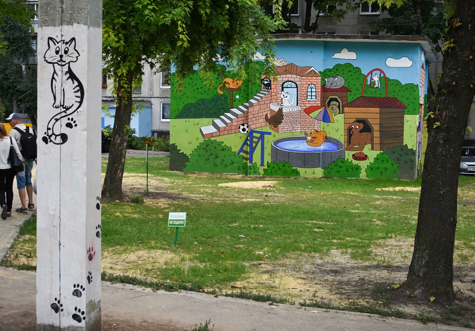 В Pet-friendly дворе по улице Библика закончил работать художник, и теперь там разрисовано все: трансформаторная будка, стены гаражей, выходящие во двор, фонарные столбы декоративные кубики и даже урны.