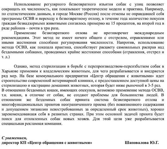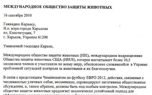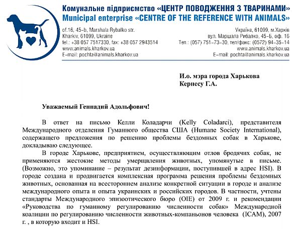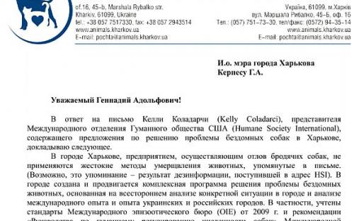 16 сентября 2010года на имя и.о. мэра Харькова от представителя Международного общества защиты животных (HSI) пришло письмо следующего содержания: