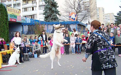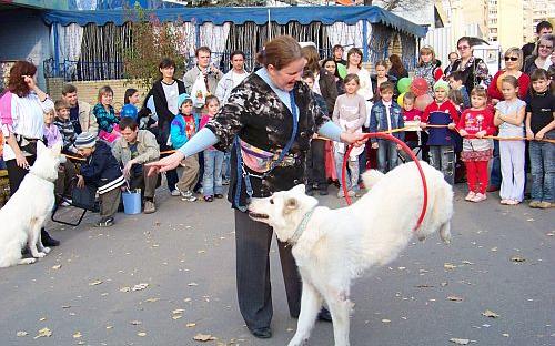 Во второй части программы выступали дрессированные собаки. Белоснежные красивые овчарки выполняли увлекательные трюки: приносили по команде различные предметы, прыгали через кольцо и через высокий турник, а их владельцы рассказывали детям о разных породах собак, о том, как важно правильно воспитывать свою собаку и чему ее можно научить, если ответственно к этому подойти.