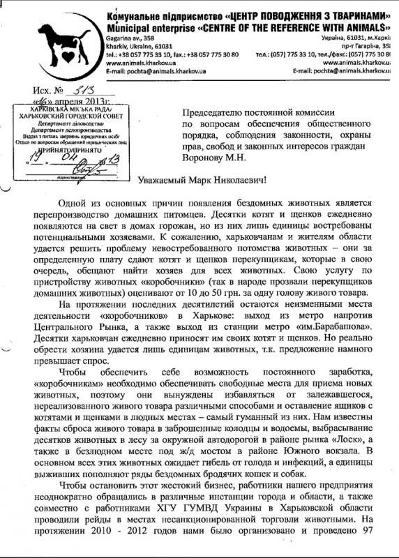 КП "Центр обращения с животными" на протяжении 3 лет предпринимает попытки ликвидации бизнеса на жизни животных, прозванного в народе "кровавым бизнесом коробочников". С 2010 года было проведено множество рейдов в местах несанкционированной торговли (в районе Центрального рынка), было направлено 24 заявления в различные инстанции. Но перекупщики домашних животных продолжают деятельность. Их можно увидеть каждый день напротив Городского Управления милиции Харьковской области, возле выхода из метро "Центральный рынок".