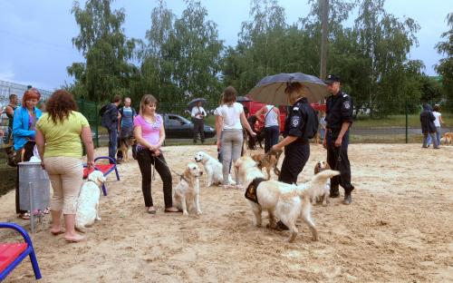 На открытие пришло много владельцев собак с питомцами. Кинологи МВД демонстрировали собравшимся послушание собак. Было интересно, даже начавшийся сильный дождь не помешал, люди не разошлись.