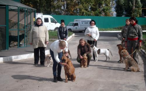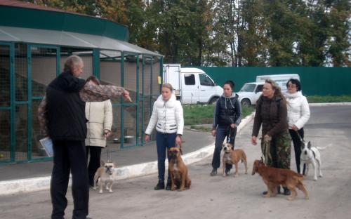 Председатель кинологического Центра Владимир Алексеевич Кисель проводит практические занятие с курсантами на базе городского приюта. Курсанты занимаются с собаками, тестируют их, социализируют, обучают командам и дают советы будущим владельцам.